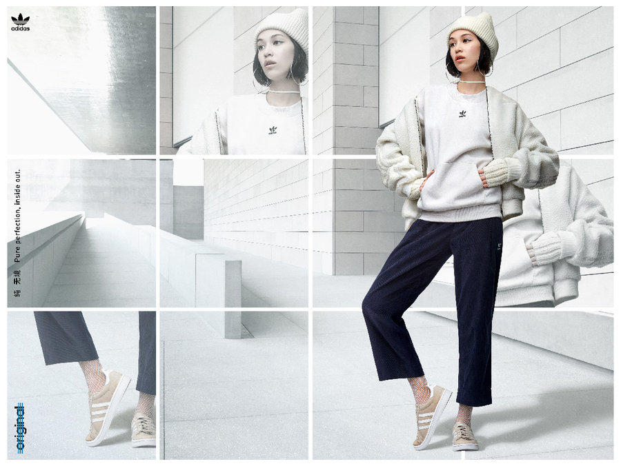 日本混血模特水原希子本次以日本街头风格形象示人,白色羊毛外套内搭纯白色 adidas Originals 三叶草卫衣与深蓝色 adidas 九分裤形成鲜明对比。