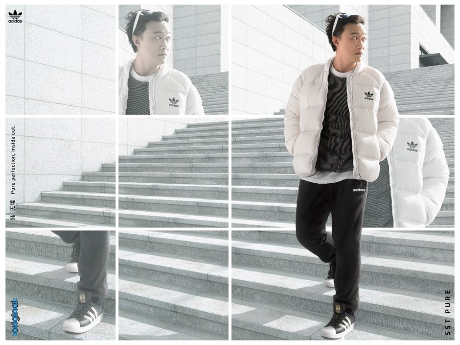 陈奕迅将纯白色的 SST Pure 羽绒外套与深灰色卫衣搭配,内搭白色 T-Shirt 和黑色运动裤带出层次感,演绎写意随性的穿衣风格。