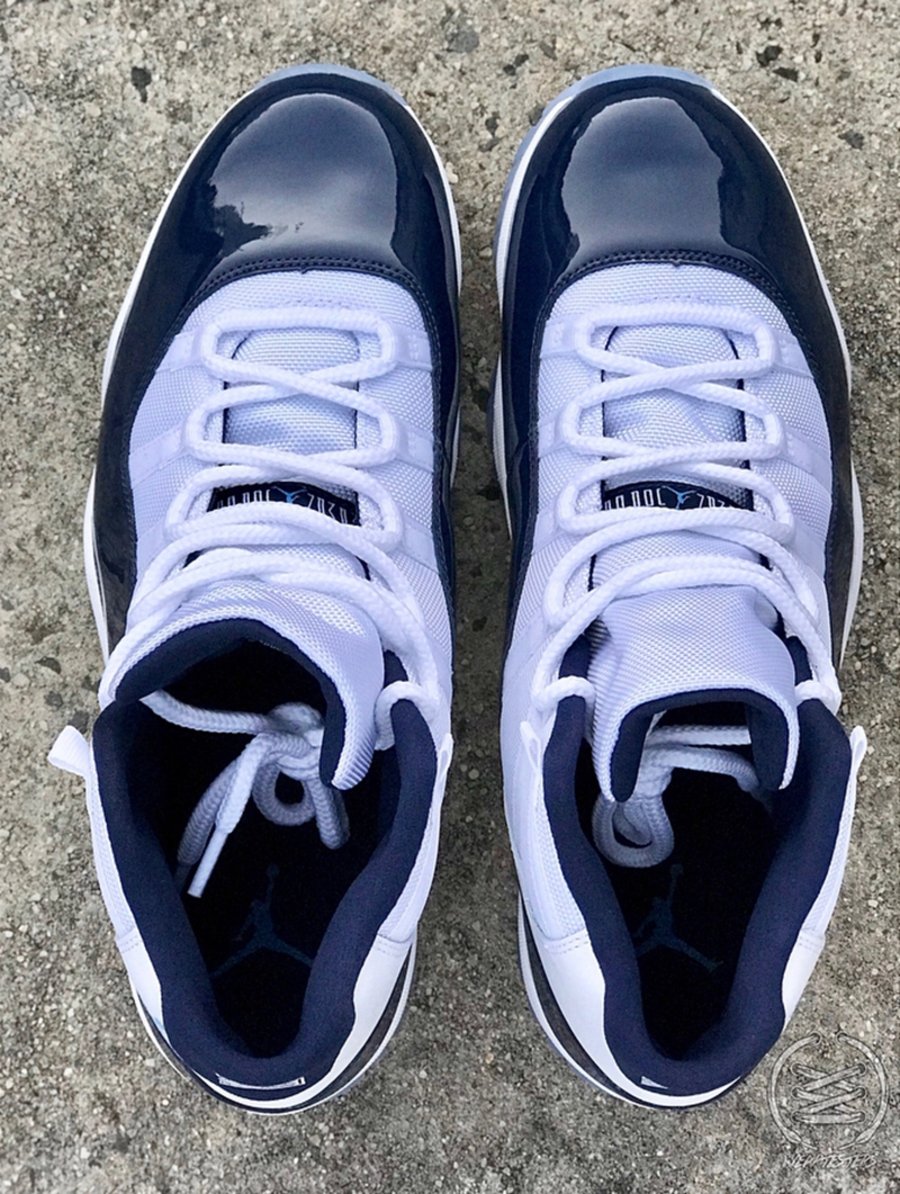 鞋款采用与 Air Jordan 11 “Concord” 相似的配色方案,海军蓝漆皮搭配白色尼龙鞋身,后跟点缀北卡色 Jumpman Logo,鞋盒依然以经典的高规格抽屉式呈现,给人一种熟悉又新鲜的视觉感受!