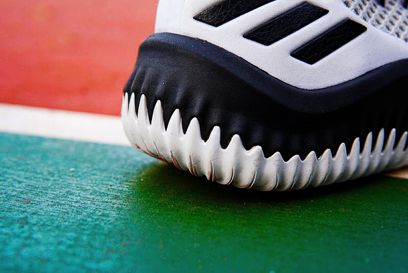 这双鞋的外底采用了较为复杂的曲线纹路,能最大程度上的提供各个方向上的抓地力,重点在于每条纹路中还加入了沟槽设计,虽然这处细节不太明显,但在实战中却极为有效的将抓地力再次提升。