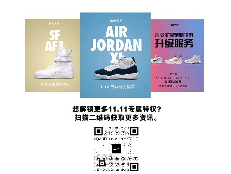 在 11 月 11 日当天 0 点,更会有一双独特的中国限定鞋款神秘上架!想要解锁更多 11.11 专属特权?不妨扫描下妨二维码获取更多资讯!