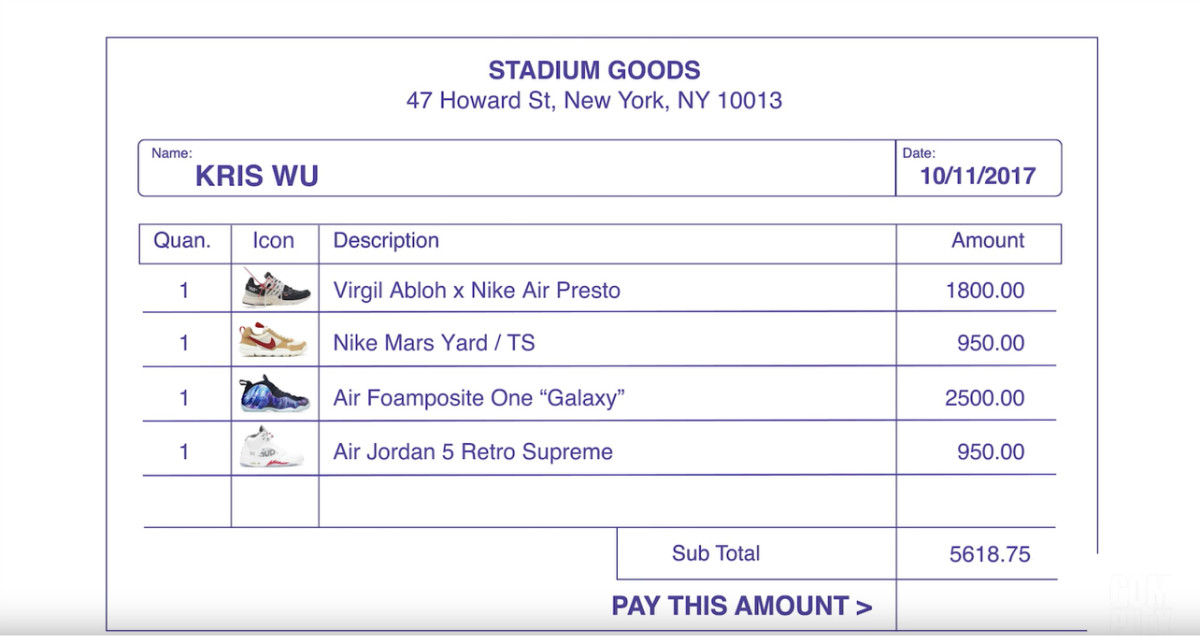 在节目的最后,吴亦凡挑选了四款球鞋,分别为 Supreme x Air Jordan 5、Nike Craft Mars Yard 2.0、Nike Air Foamposite One “Galaxy”、Virgil Abloh x Nike Air Presto!一共花费 $6,750.25 美金!