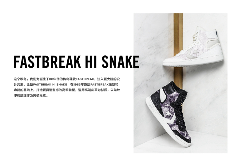 另外一款 Fastbreak Hi Snake 则以高帮造型构成,在原先复古轮廓的基础上,选用优质皮革制作鞋面,辅以奢华的蛇纹印花提升质感,定价为 ¥799 RMB。