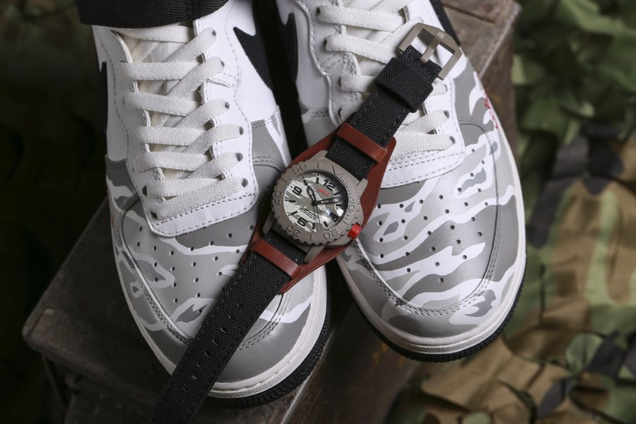 近日知名球鞋定制团体 SBTG 携手日本球鞋店铺 atmos 及手表定制品牌 UNDONE 推出三方联名,联名以套装形式发售,包含一双 Nike Air Force 1 和一只 UNDONE AQUA 潜水表,并且全球仅限量发售 12 套。
