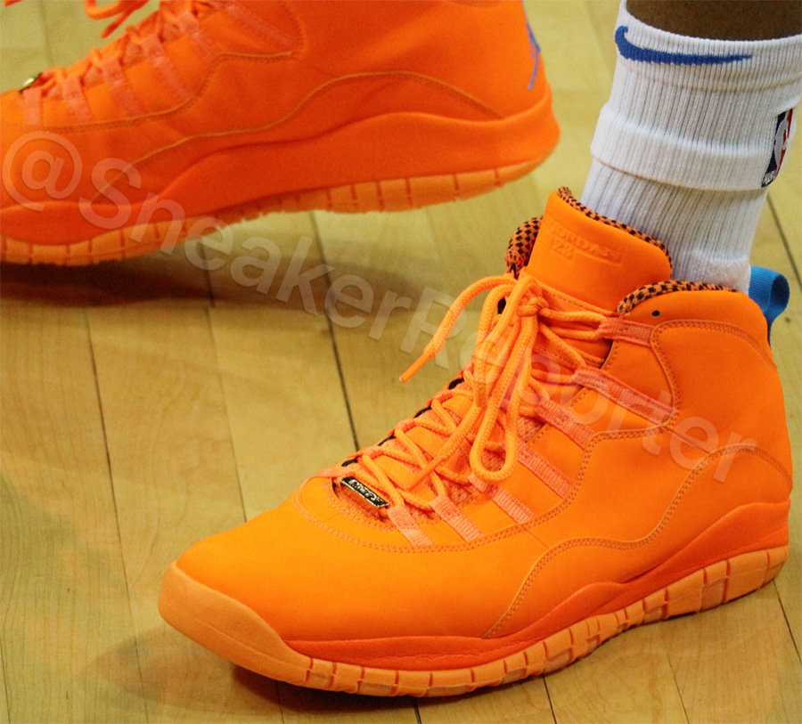 威少 29 岁生日!他今天的上脚也格外的炸眼,选用了一款橙红全身呈现的 Air Jordan 10 “Why Not”。 后跟的 Jumpman Logo 飞人标志和鞋提采用了蓝色打造,整体依然是辨识度极高的 OKC 雷霆装扮。(pic via sneakerreporter)