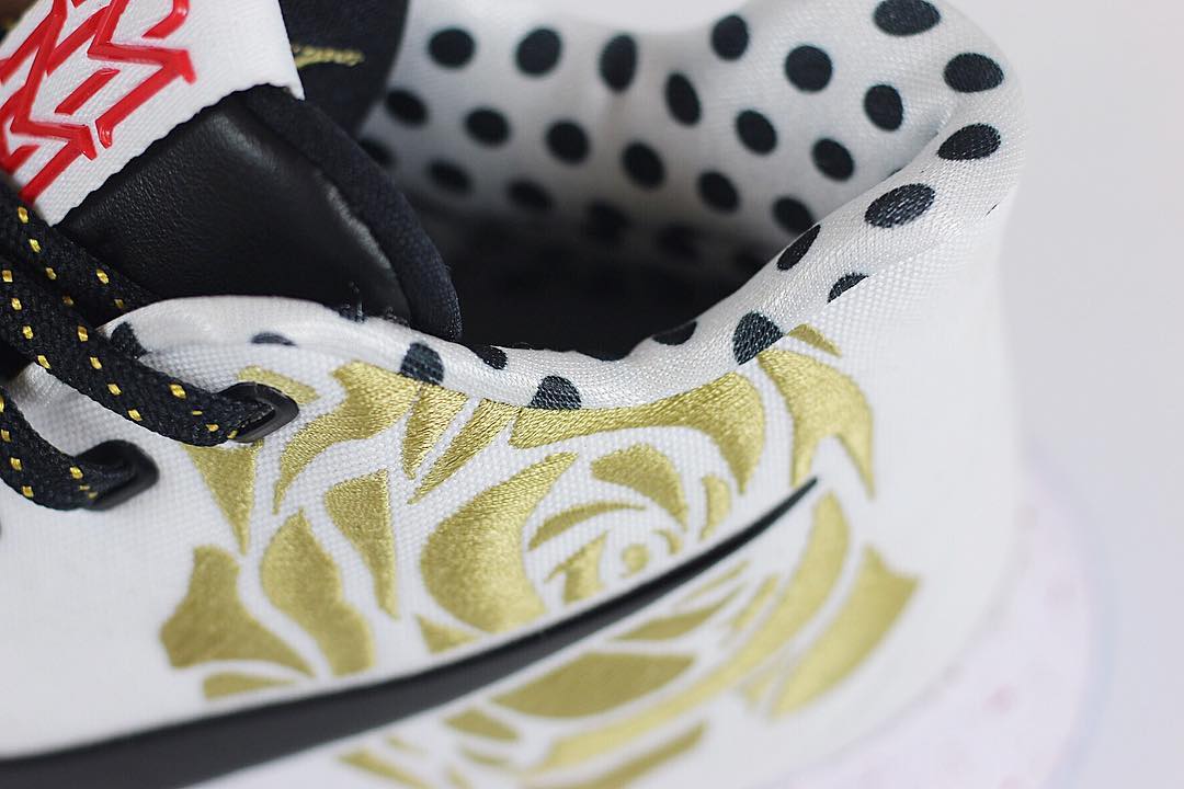 鞋款整体以黑、白、红三色为主调,白色基调下搭配白红相间的鞋带,Swoosh Logo 则使用黑色,最为亮点的细节在于鞋身印有一朵极为醒目的红色玫瑰花。