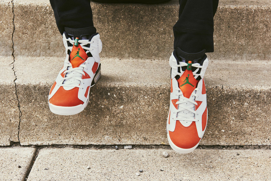 系列配色都以 Michael Jordan 在 1991 年拍摄的佳得乐广告为灵感,其中 Air Jordan 6 “Gatorade” 与 “胭脂红” 配色相似度极高 ,在鞋带扣和鞋垫上都印有佳得乐经典的闪电 Logo,整体以橙红色、白色为主,Jumpman Logo 等细节使用绿色点缀。Air Jordan 32 Low 同样以佳得乐的白、橙、绿三色为主题。两双鞋都让人十分期待。