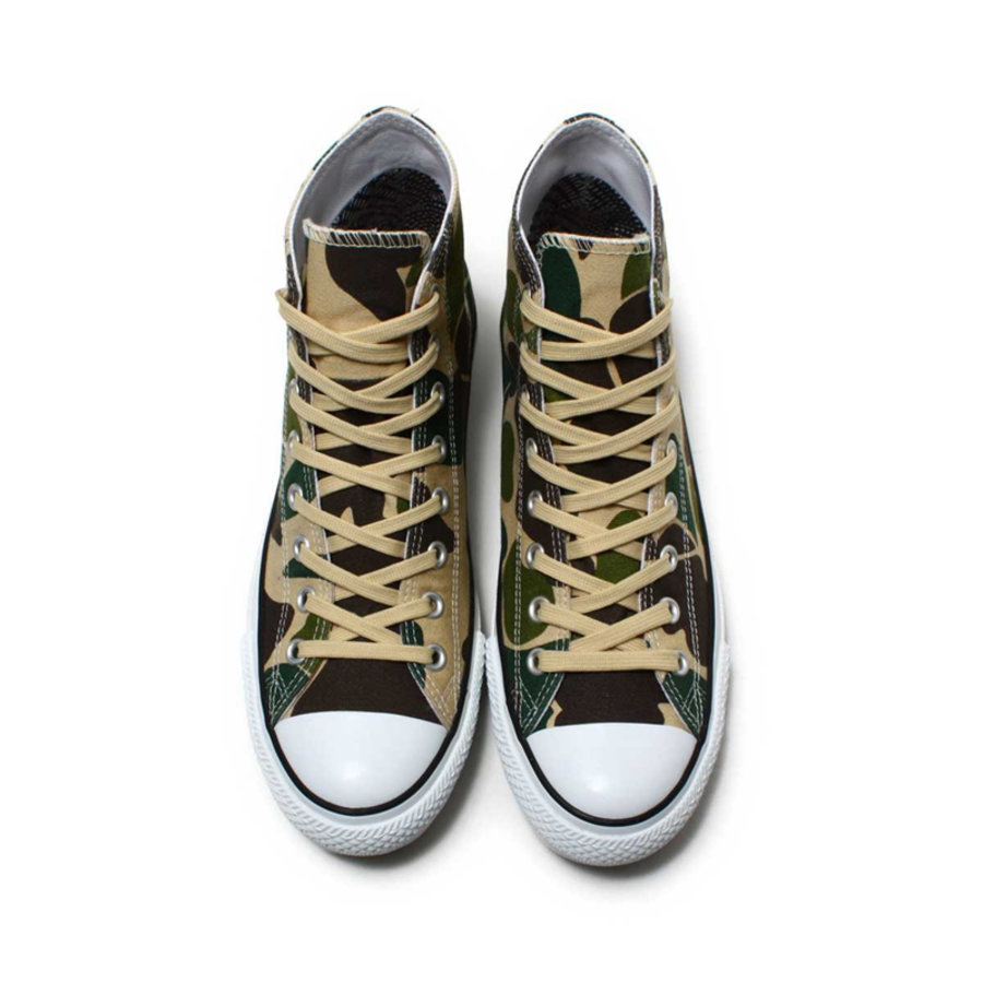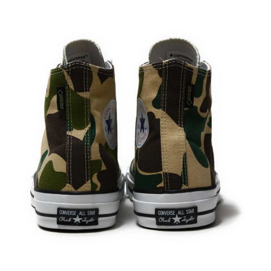 在保持原本高帮 Chuck Taylor All Star 造型的同时,采用 GORE-TEX 防水科技面料制作鞋面,搭配辨识度极高的迷彩图案呈现,并于后跟缀有 “GORE-TEX” 字样标识表明身份。