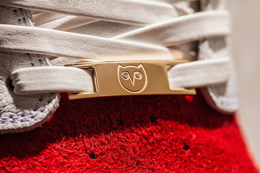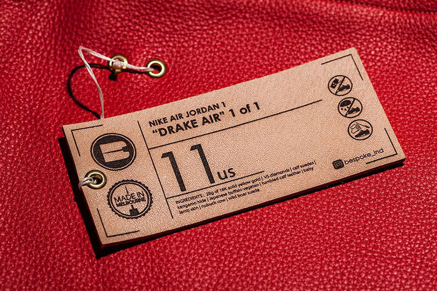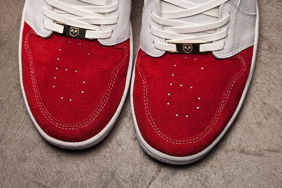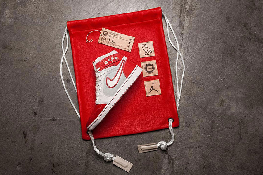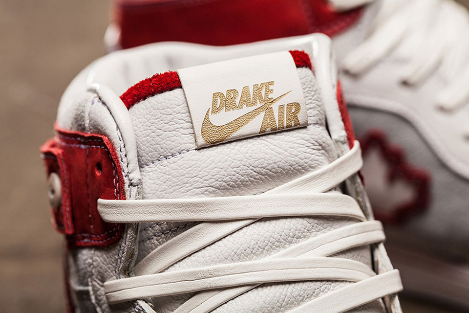 鞋款以白、红、灰三色为主调,使用质感极佳的翻毛皮质打造鞋身,鞋帮处点缀类似山羊图腾的图案,鞋身内侧刻印有加拿大国旗,鞋舌 “Drake” 显示球鞋的主人,最奢华之处在于鞋带扣使用 18K 金打造,印有 OVO 猫头鹰 Logo,而猫头鹰的眼睛则使用钻石。