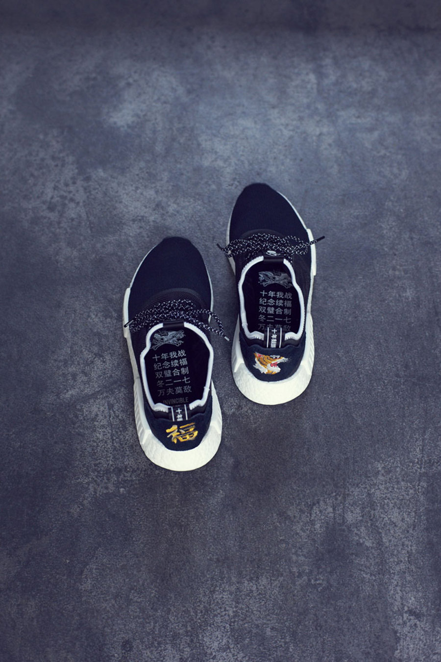 后跟金色电绣虎头及 “福” 字更是霸气十足让人印象深刻,鞋垫与后跟鞋提上 “十年我战、纪念续福、双璧合制、冬二一七、万夫莫敌” 字样更是点睛之笔,此灵感源自 NBHD 2004 年 10 周年打造的 M65 内标中的标语,意义非凡。
