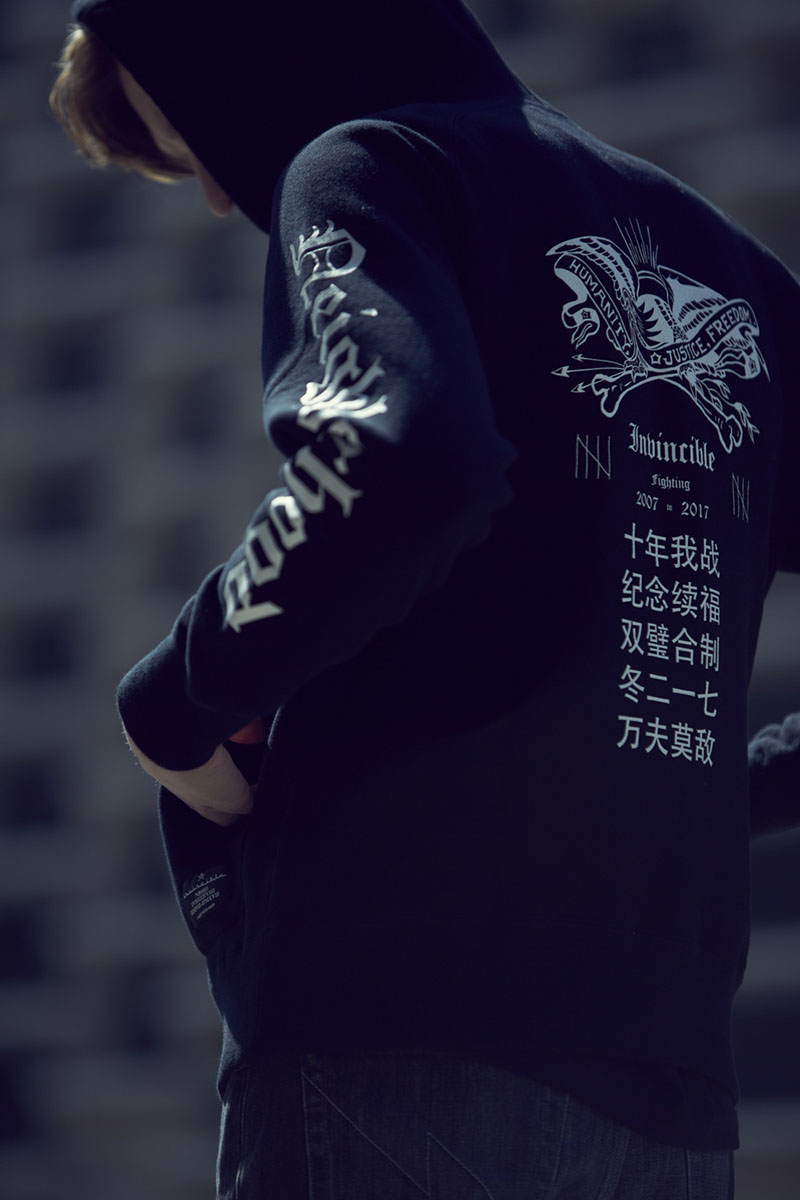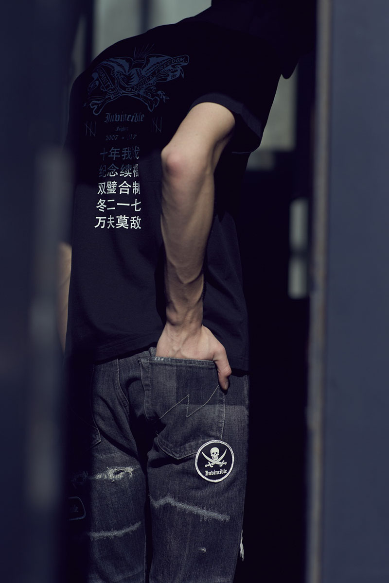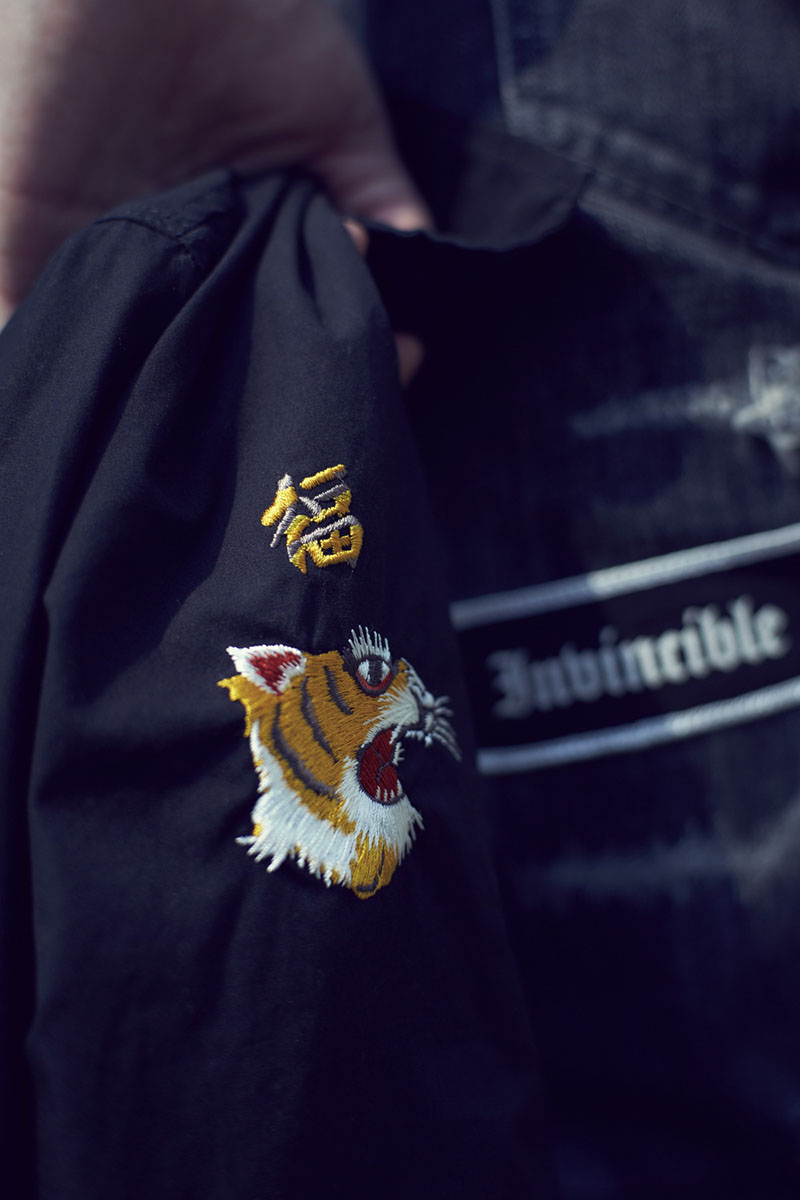 承袭鞋履上的酷黑风范,同样注入电绣虎头、“福” 字和文字标语等独特元素,最后值得一提的是原汁原味复刻 NBHD 2004 年 Ripper Savage 经典牛王,经过十三年后泷泽伸介也特别再次将本裤型回归,并添加专属 INVINCIBLE Patch & NBHD 海盗骷髅图腾凸显纪念意义。