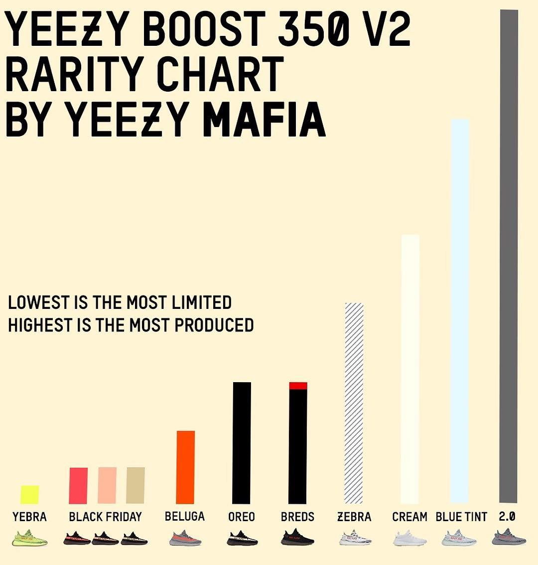 今日我们熟悉的 @Yeezy Mafia 又释出一张 350 V2 鞋型历代货量图,在感叹新灰橙入手难度降低之余,两次发售的超高人气白斑马总体货量已接近纯白,目前市场行情从首发破万下降至目前 ¥4000 元左右。黄斑马无疑是最为稀有的 V2 配色,看看下图你心仪的配色都是什么规模吧。