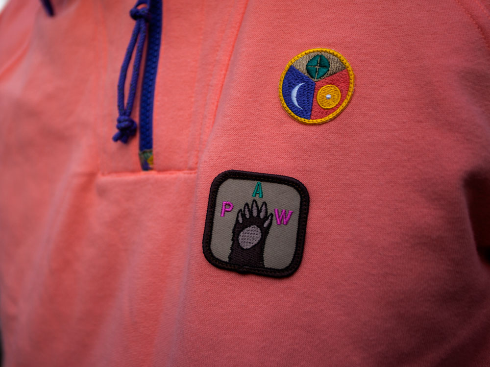 粉色帽衫是该系列最醒目的单品,搭配搞怪玩味的刺绣勋章,富有代表性的点缀让人们再次对菲董联名印象深刻。