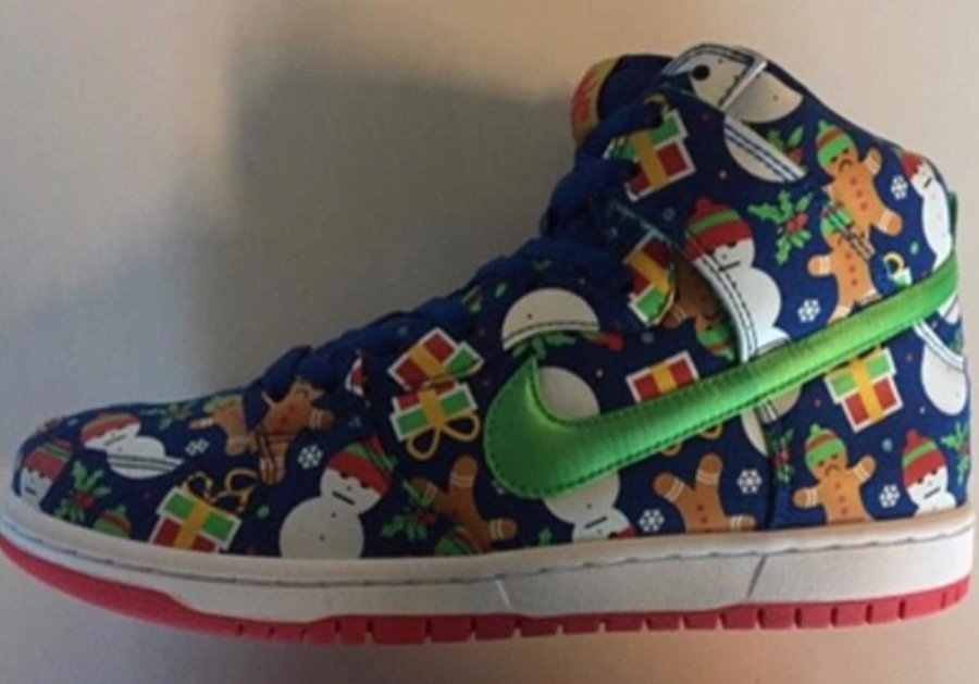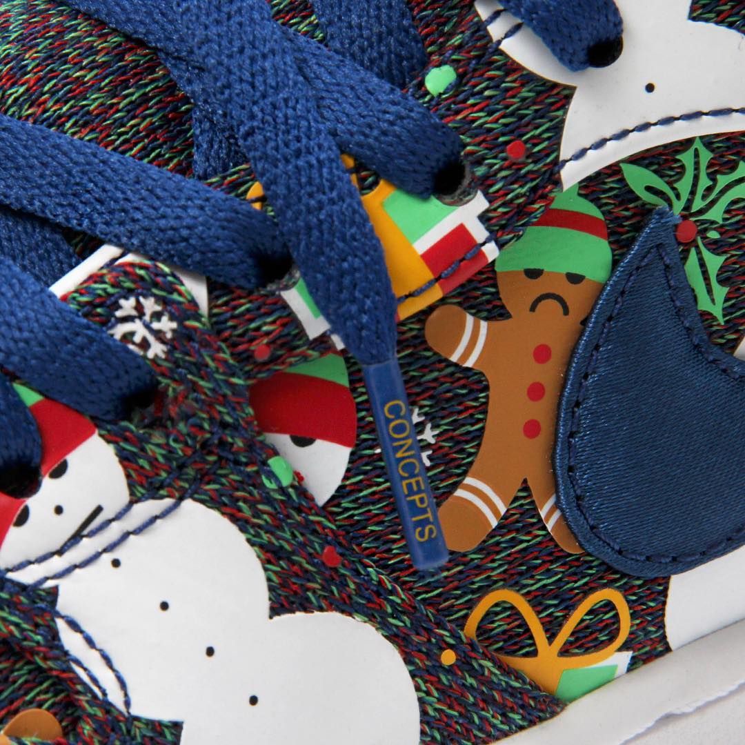 眼前这双 2017 款 Concepts x Nike SB Dunk High “Ugly Christmas Sweater” 依然以 Dunk SB Hi 为蓝本,将雪人、姜饼人、礼盒、雪花等圣诞元素置于鞋身之上,红绿的传统圣诞色调点缀细节,鞋舌部分不仅凸显双方身份,更采用毛线物料打造,直击主题。同时附赠 4 色鞋带,并将推出全家族尺码。