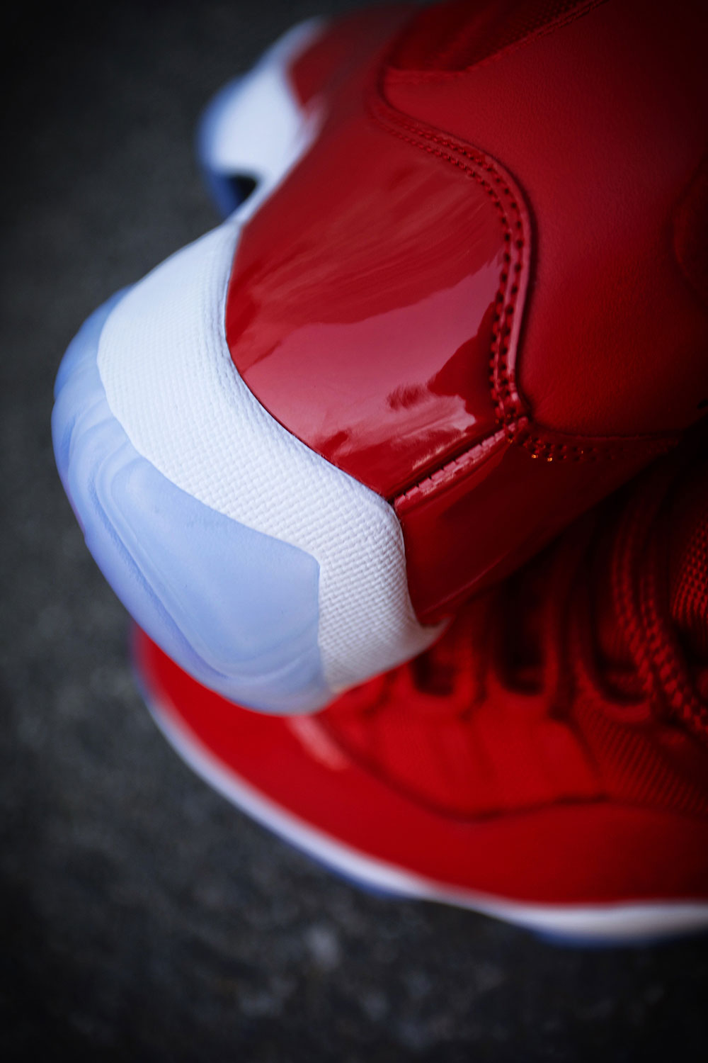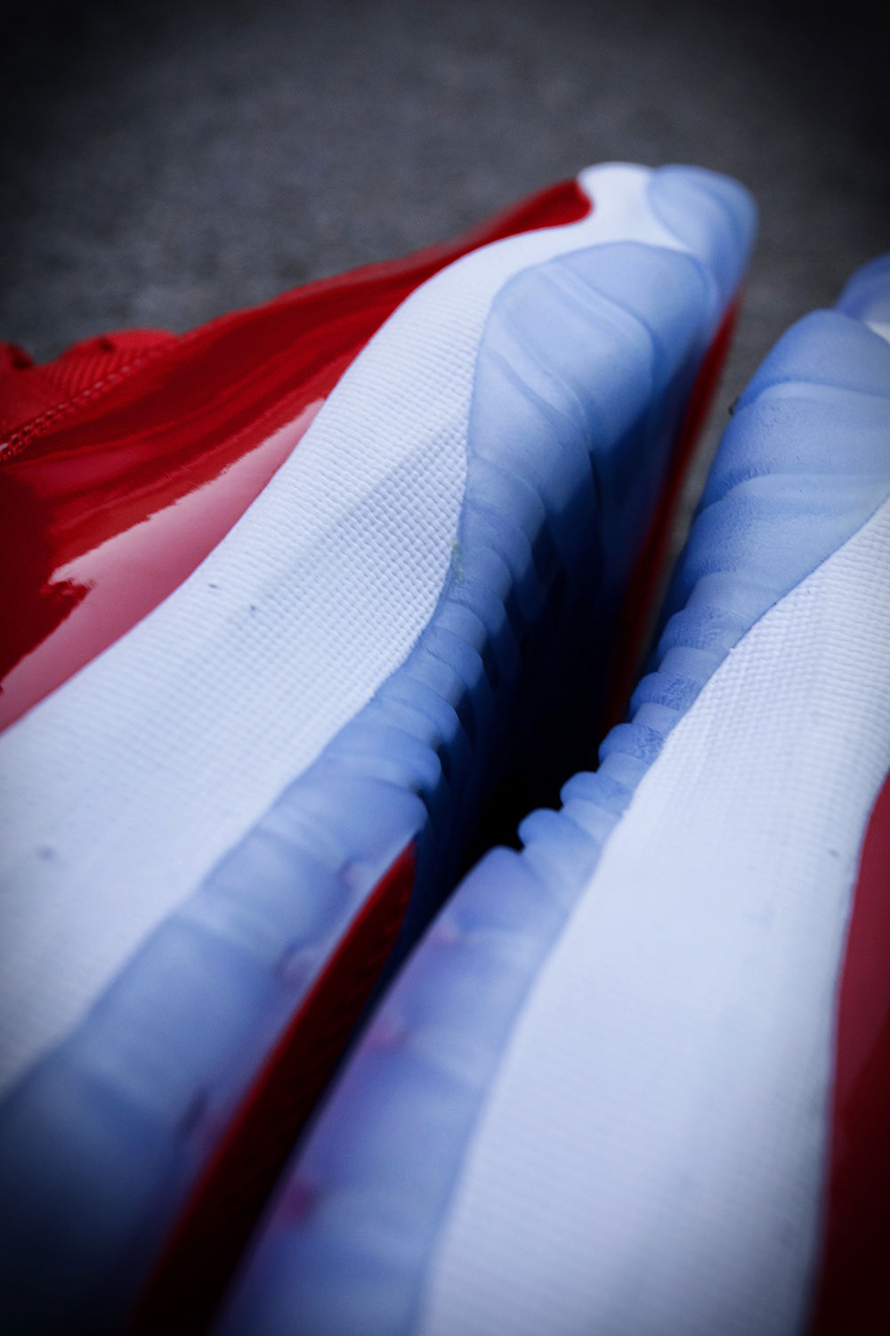 鞋款此次依旧采用大漆皮的设计,完美的致敬了元年的设计,经典的白红配色还是公牛主场队服配色,淡蓝色水晶底的映衬恰到好处,让整双鞋更加干净通透。