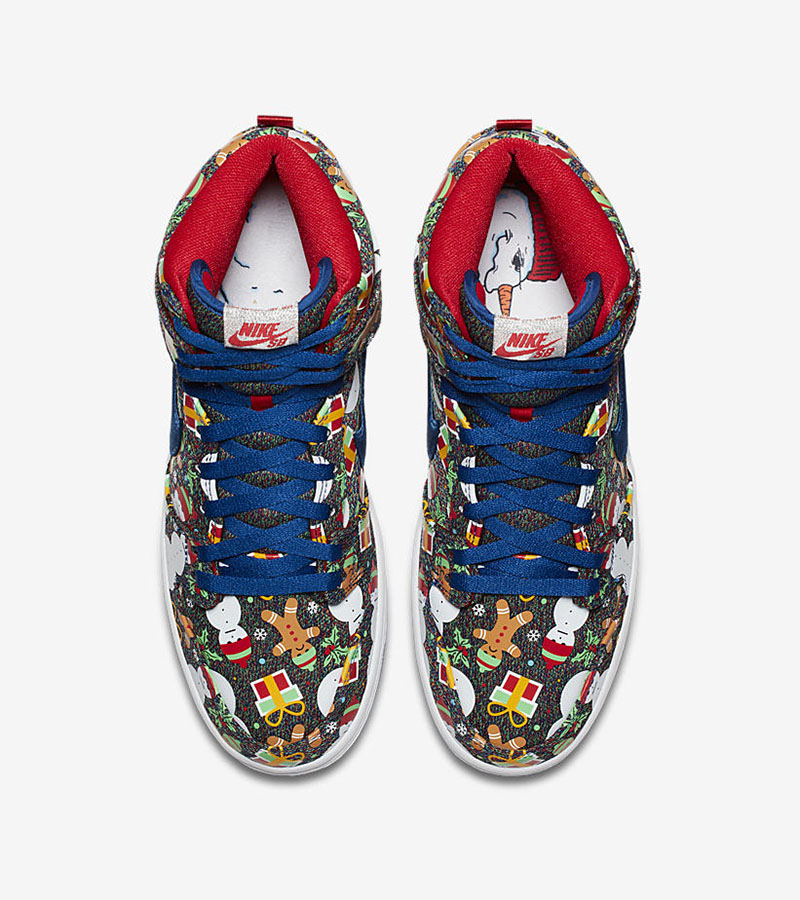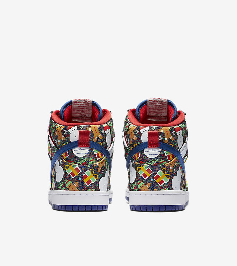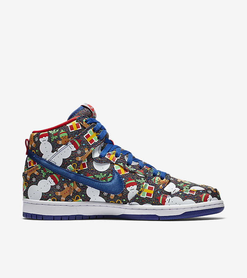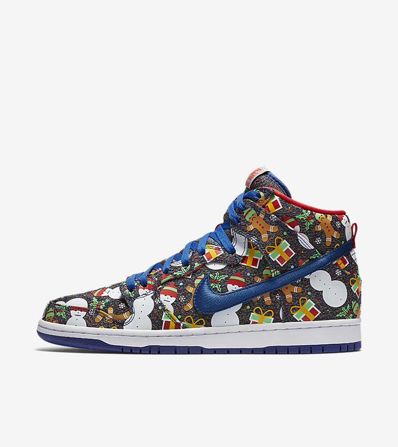 2017 款 Concepts x Nike SB Dunk High “Ugly Sweater” 依然将雪人、姜饼人、礼盒、雪花等圣诞元素置于鞋身之上,营造满满的节日气氛,精致非凡。