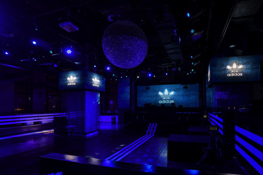 派对入口的 LED 屏幕上循环播放 adidas Originals 2017 秋冬广告大片 “原创不息” 第三章节,现场由品牌的标志性蓝色霓虹灯及 LED 灯折射出神秘光芒,经典的白色三条杠连接室内空间,配合播放令人目不暇接的品牌视频,派对被浓厚的街头气息所包围,让到场嘉宾感受原创力量。