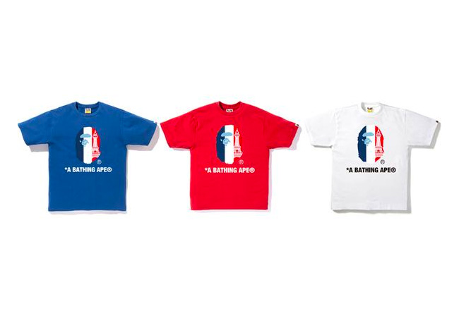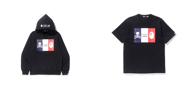 BAPE® x mastermind JAPAN 联名系列则包含 T 恤和帽衫,猿人头像和骷髅头标志呈现于法国国旗的两侧。