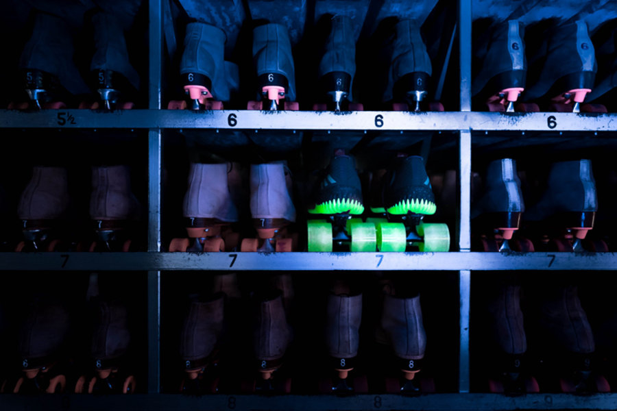 鞋面选用深灰色装扮为主基调,辅以酒红及青蓝色调点缀细节,中底注入泼墨元素,搭配荧光绿色夜光大底收尾,最大的亮点在于鞋底特别加入双排滚轮,成为了真正意义上的旱冰轮滑鞋!