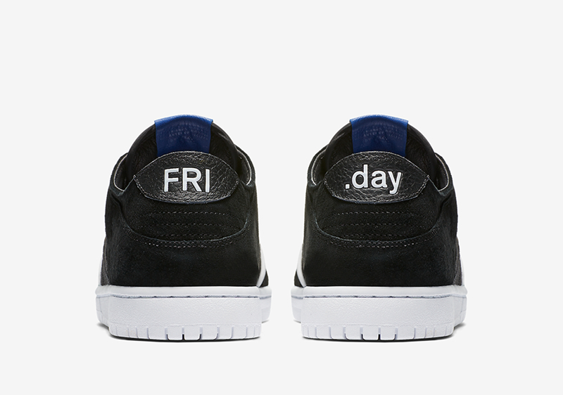 本次推出的 Dunk SB 采用低帮及高帮两款鞋型为设计蓝本构成,分别以酷黑及米白色调呈现,辅以蓝色装扮点缀细节,并在后跟印有 “FRI.day” 字样彰显主题,辨识度极高!