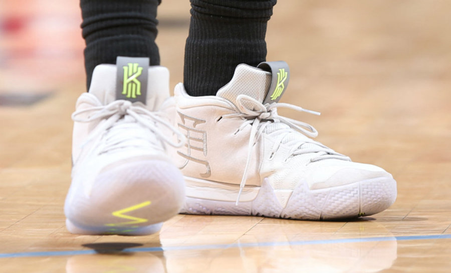 之后的正式比赛里,欧文换上另一款同样采用纯白主题打造 Kyrie 4 新配色,鞋舌及大底线条选用醒目的荧光绿色构成,并在鞋身内侧印有 “勇” 字汉字刺绣点明主题,清爽又养眼!