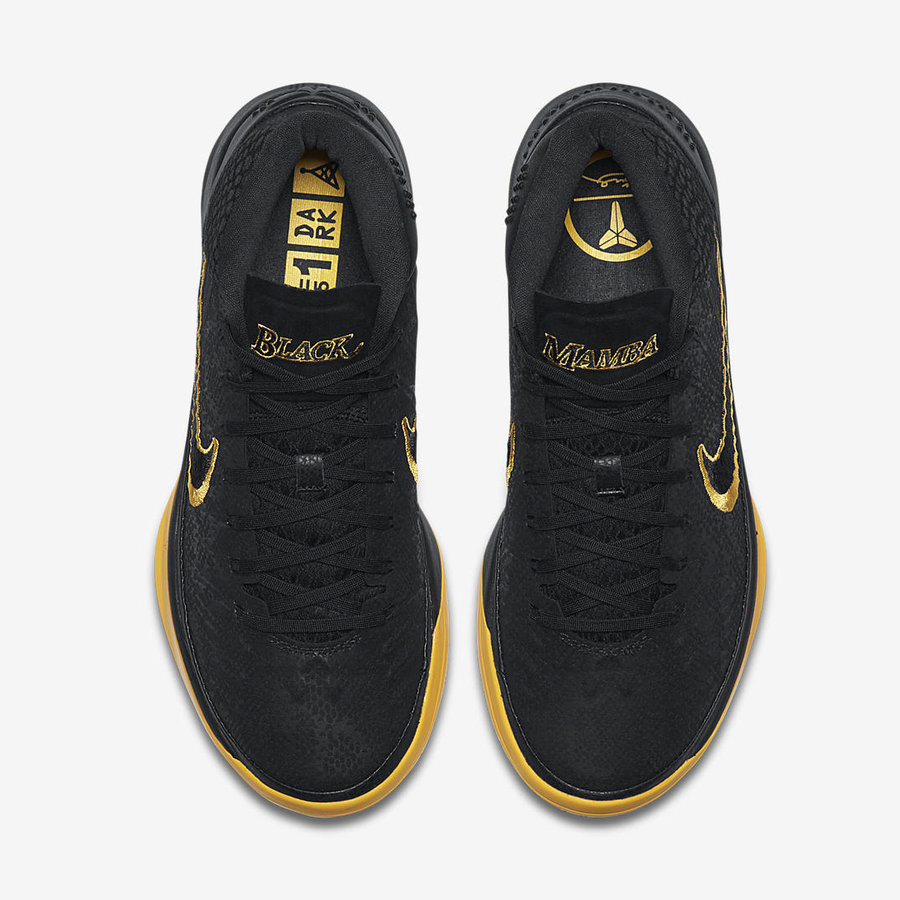 鞋面以黑色反光鳞片打造,鞋身 Swoosh Logo 则以黄色刺绣包边点缀,鞋舌 Black Mamba 直击 kobe 本人 “黑曼巴” 主题,致敬意味浓厚。