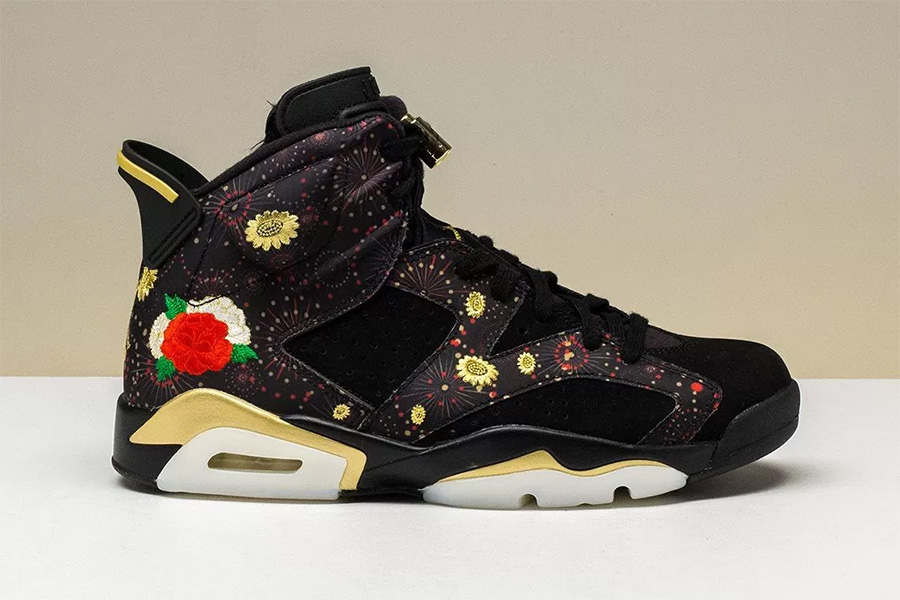 眼前这款 Air Jordan 6 “CNY” 则是今年最新的中国配色,在黑色的麂皮鞋身基调之下,呈现了烟花纹理,再现了除夕之夜的烟花盛放之景,借以表达节日的欢快氛围。