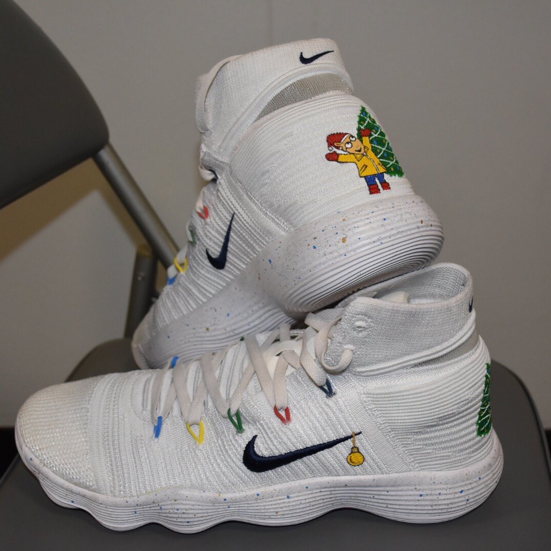 圣诞大战如约而至,作为 Nike Hyperdunk React 2017 代言人,追梦格林今天上脚了一款独特的圣诞定制战靴。 以纯白 HD 2017 Racet 为蓝本,将美国国民动画之一《亚瑟小子》的主人公食蚁兽 Arthur Read 置于后跟之上,身旁圣诞树与五彩缤纷的动态飞线及泼墨中底,营造出喜庆的节日气氛。 作为圣诞专属定制的 PE 版本,自然不会市售,我们也只能通过图片一睹真容了。 pic via:juliephayer