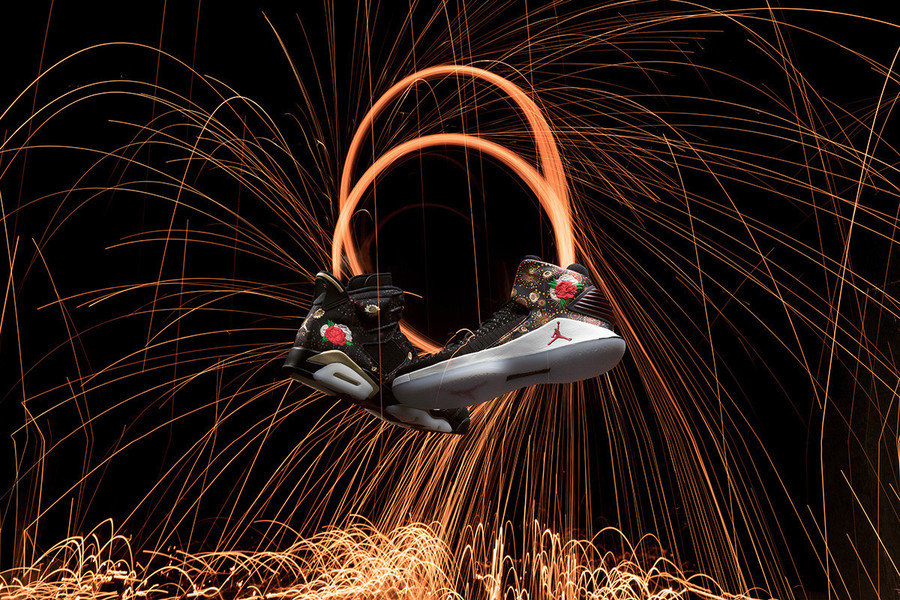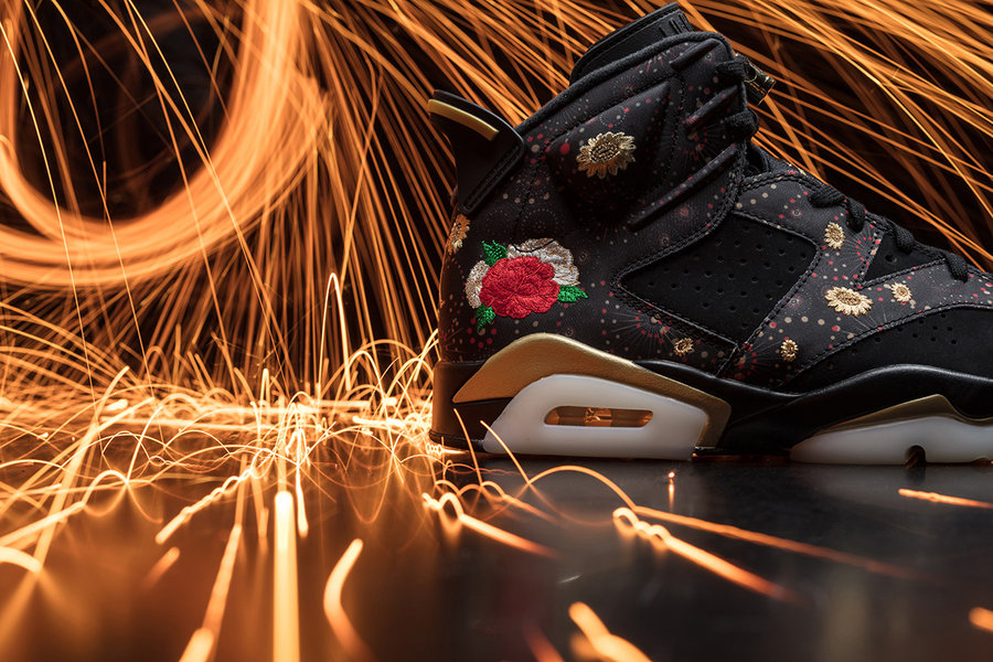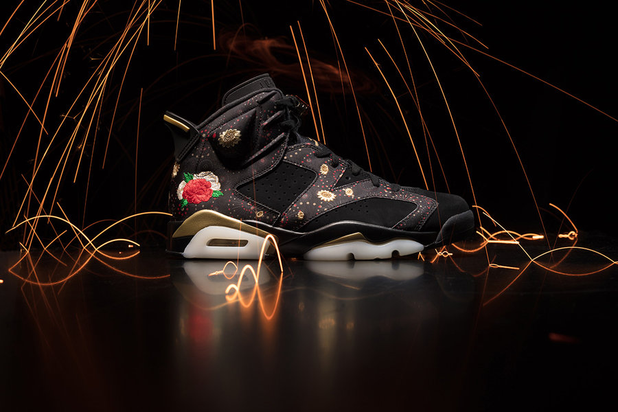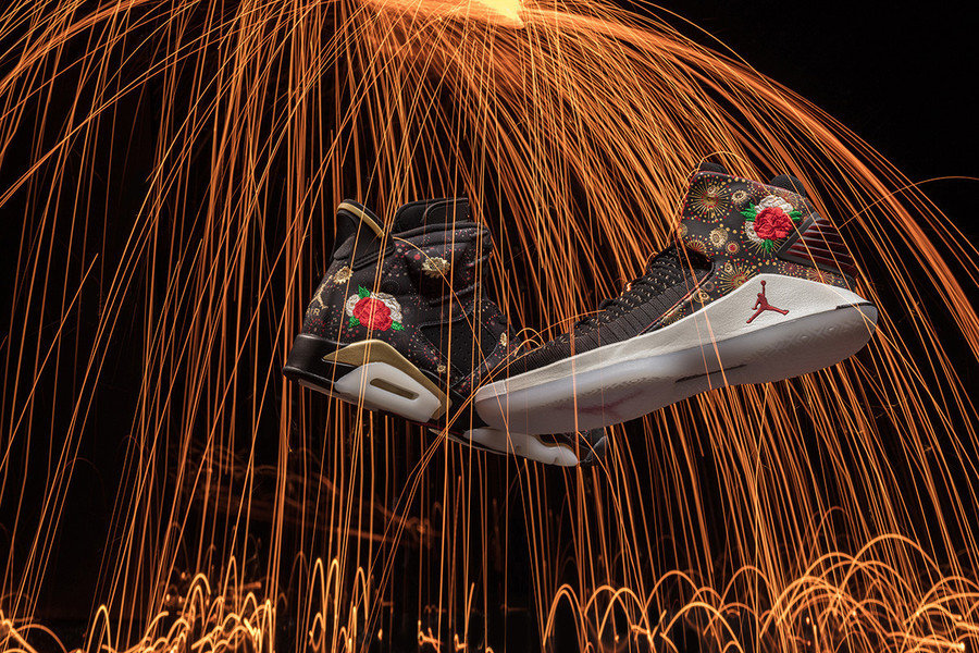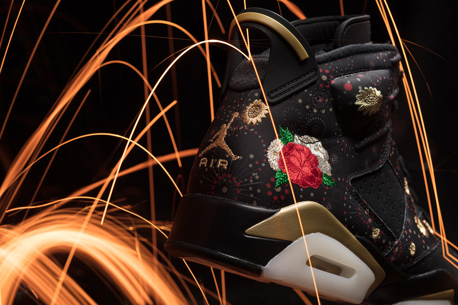 整体以黑为底色,在鞋面上采用绚烂多彩的烟花进行点缀,并以充满节庆气氛的金色花朵以及艳丽的刺绣花朵为整体添加亮点,再现了除夕之夜的烟花盛放之景,传递 Jordan Brand 的 “斗志昂燃” 精神。