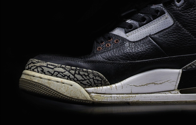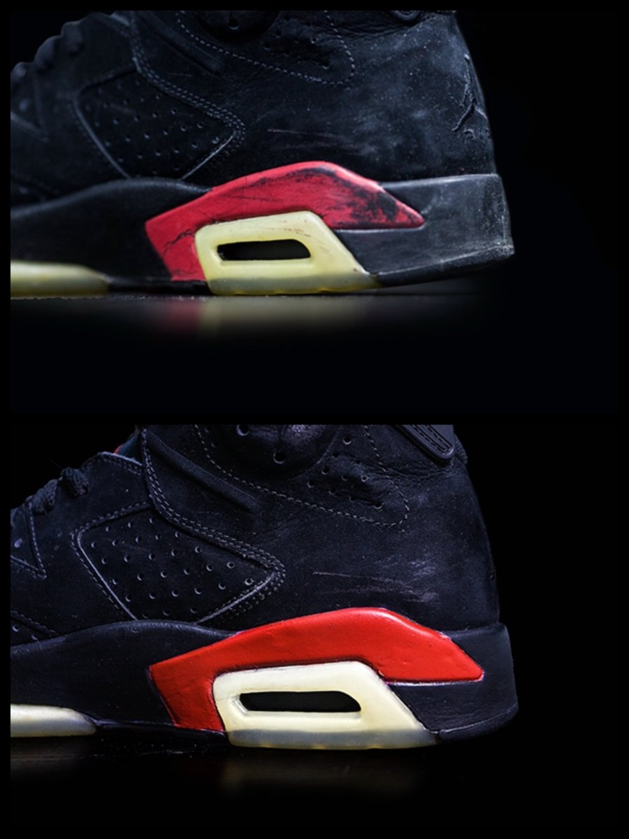 另一款 Air Jordan 6 也同样存在着爆漆的硬伤,这双老黑红配色经过时间的推移后,内外侧中底早已遍体鳞伤。