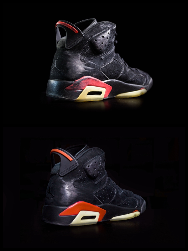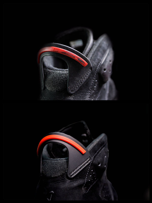 还是这双老黑红 Air Jordan 6,由于年事已高,后跟拉环早已出现断裂现象,但这也不是问题,裂了没关系,可以更换啊!