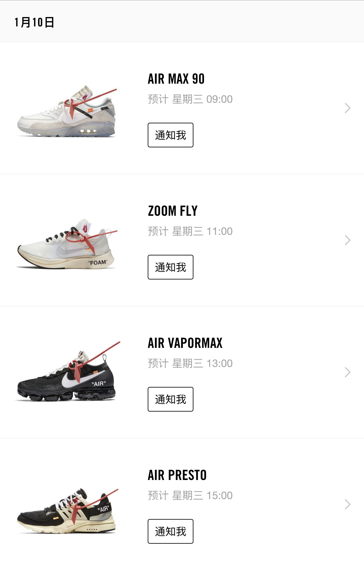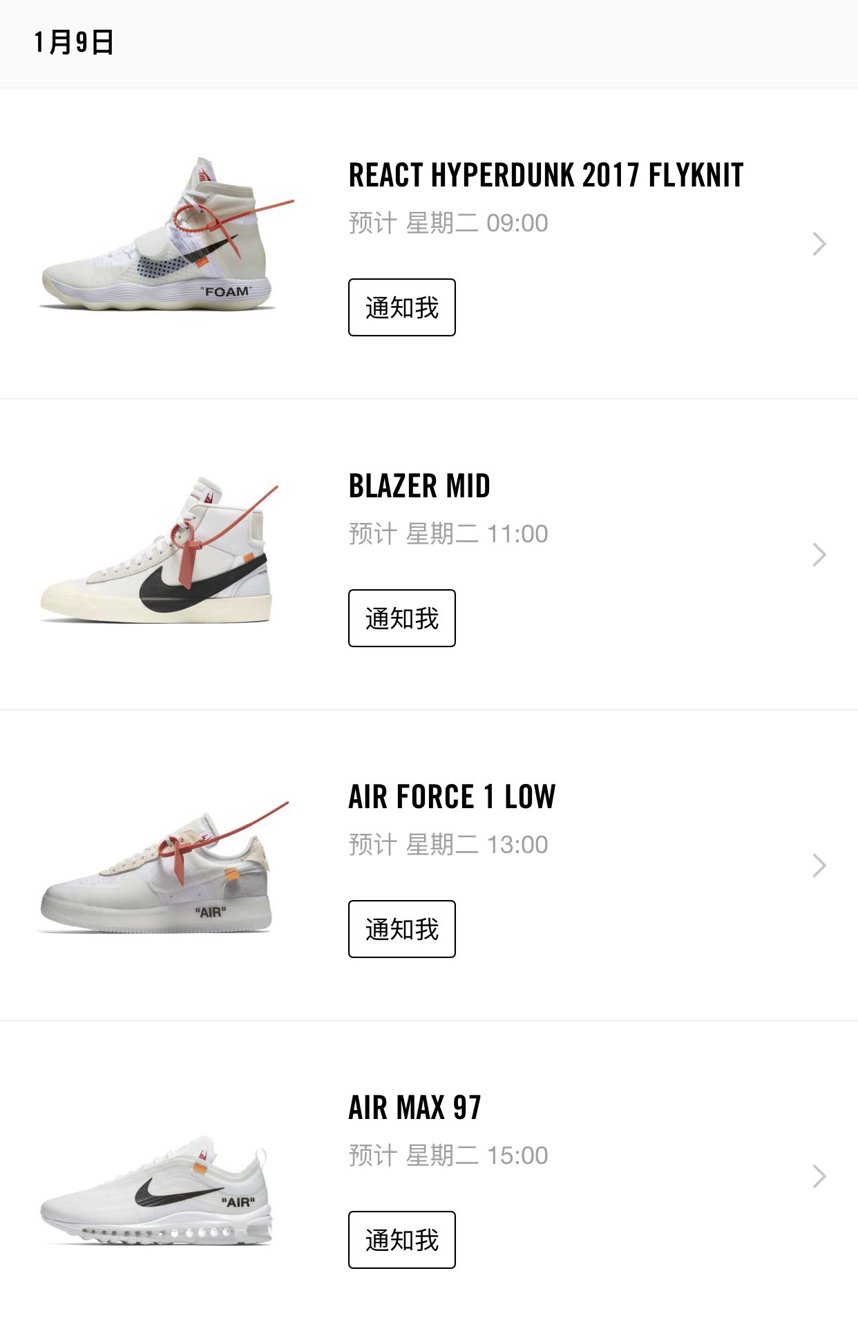 今天中国区 Nike.com 终于放出预告,OFF-WHITE x Nike 将在下周官网和 SNKRS App 正式发售,时间定于 1 月 9 日和 1 月 10 日两天,通过不同时段陆续发售,想要抓住这个最后原价入手的机会?下面可要看仔细了!