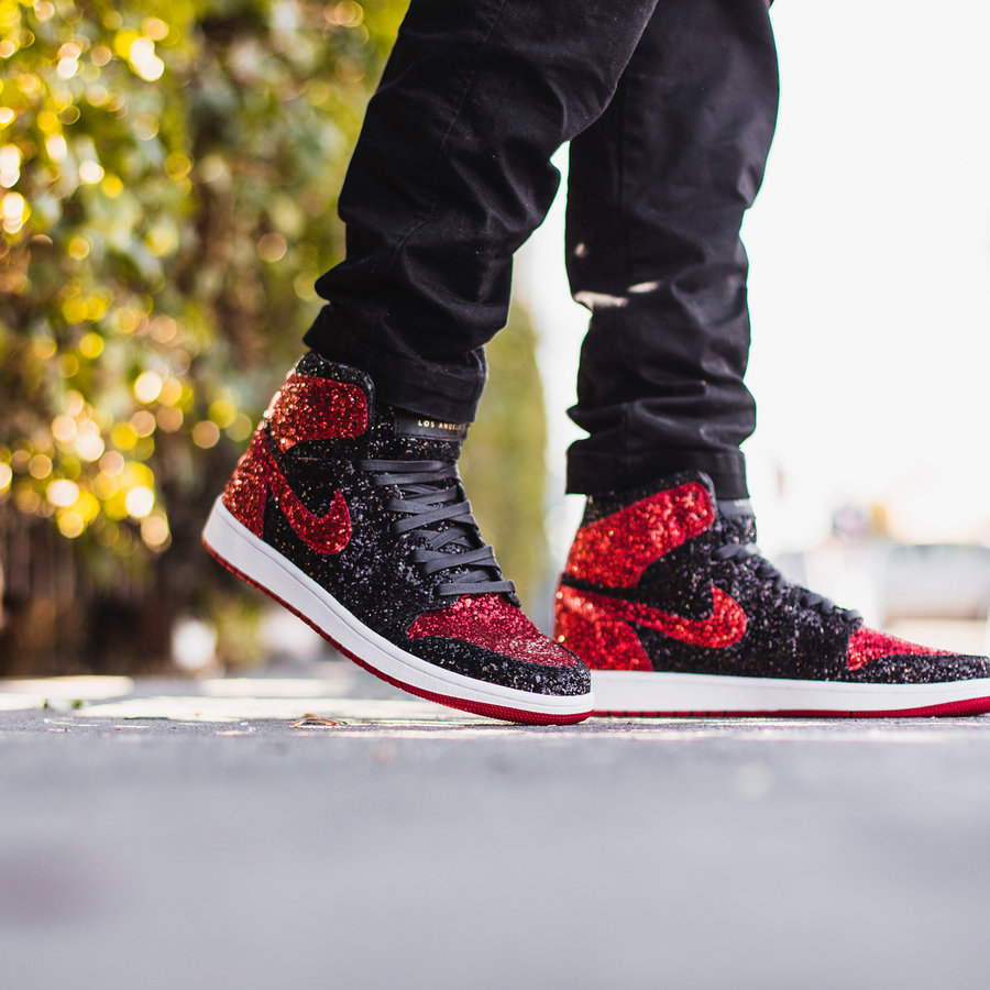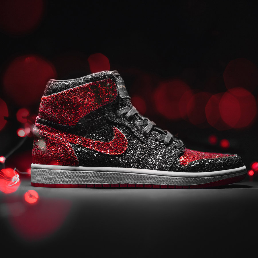 以黑红 Air Jordan 1 “Bred” 为原型,打造出 BlingBling 的定制鞋款,视觉效果如同镶钻一般,售价高达 $1000 美元,全球限量 100 双,这样的球鞋穿出去就是炸街的存在!