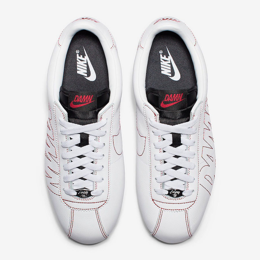 鞋身以纯白覆盖,醒目的红色 DAMN. 字体与鞋舌标签直击专辑主题。上脚表现不仅简约复古,更极具视觉辨识度,让人过目不忘!