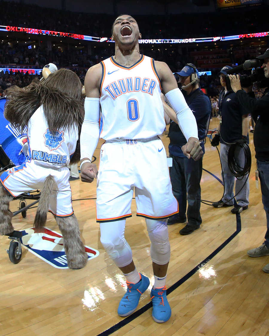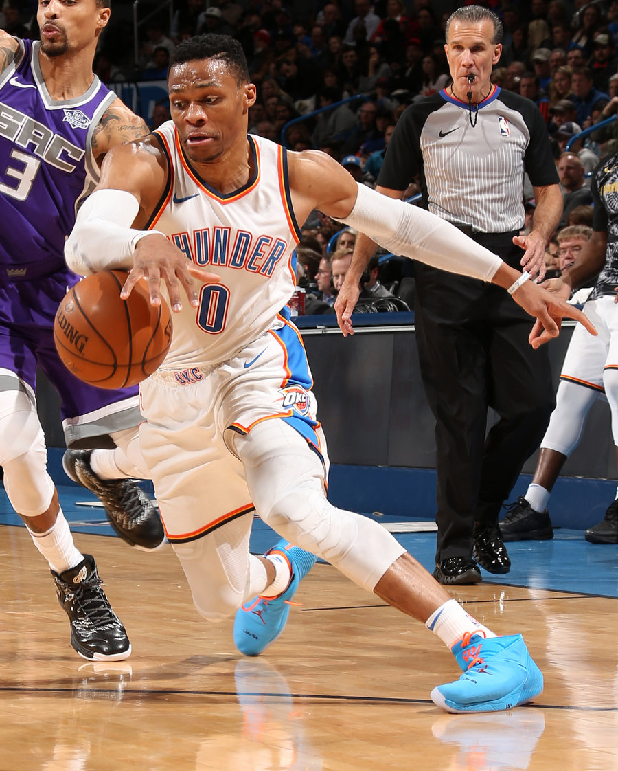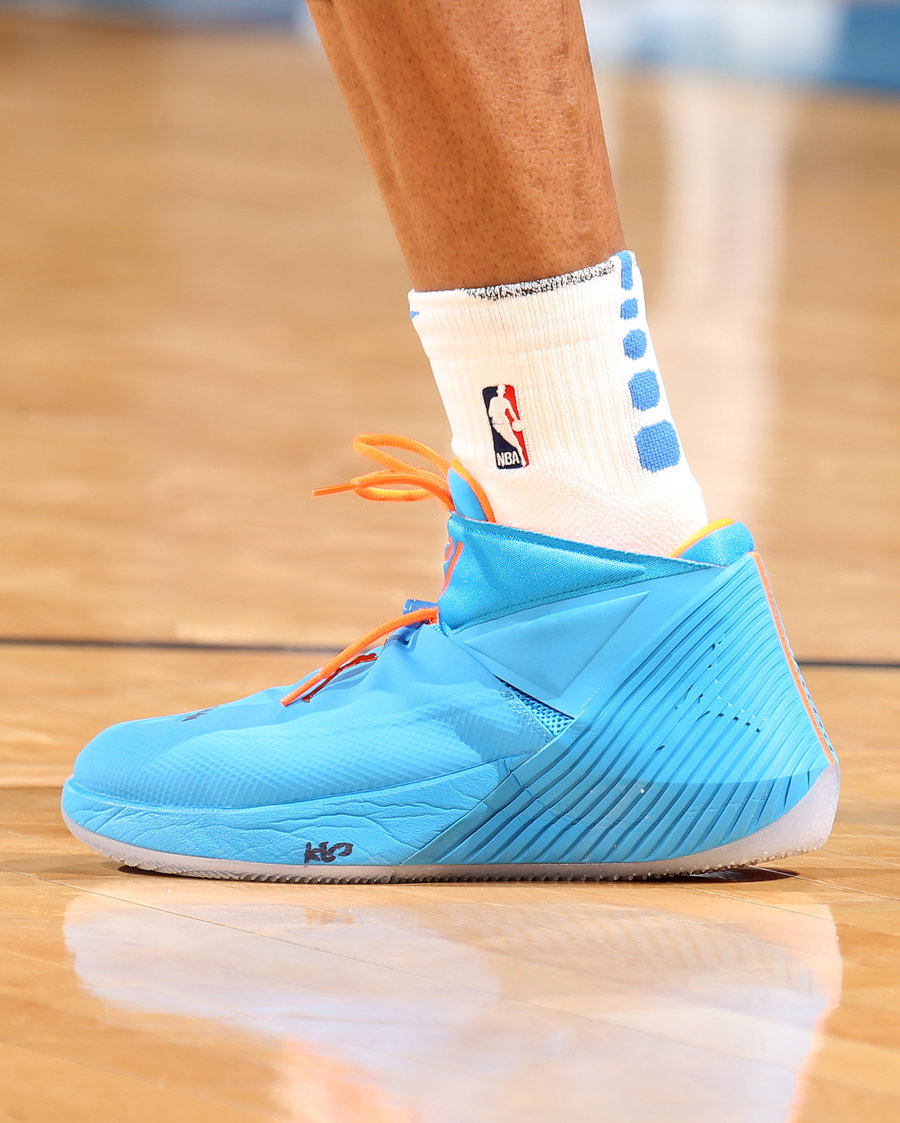 在成为 Jordan Brand 代言人多年之后,雷霆当家球星威斯布鲁克终于迎来了自己首双签名战靴 Jordan Why Not ZERO.1,近日他在赛场上又上脚了一双全新配色。 鞋款整体以淡蓝色为主调,鞋面上的 Swoosh Logo、鞋带、后跟和外底等细节加入亮眼的橙色点缀,搭配冰蓝色水晶大底,与雷霆主场球衣极为搭配。 这双全新配色目前尚未有市售信息曝光,如果有市售计划相信一定会有不少粉丝等着入手! Pic via:br_kicks / slamkicks