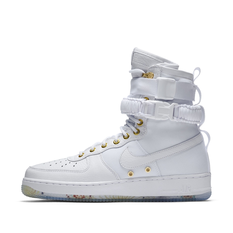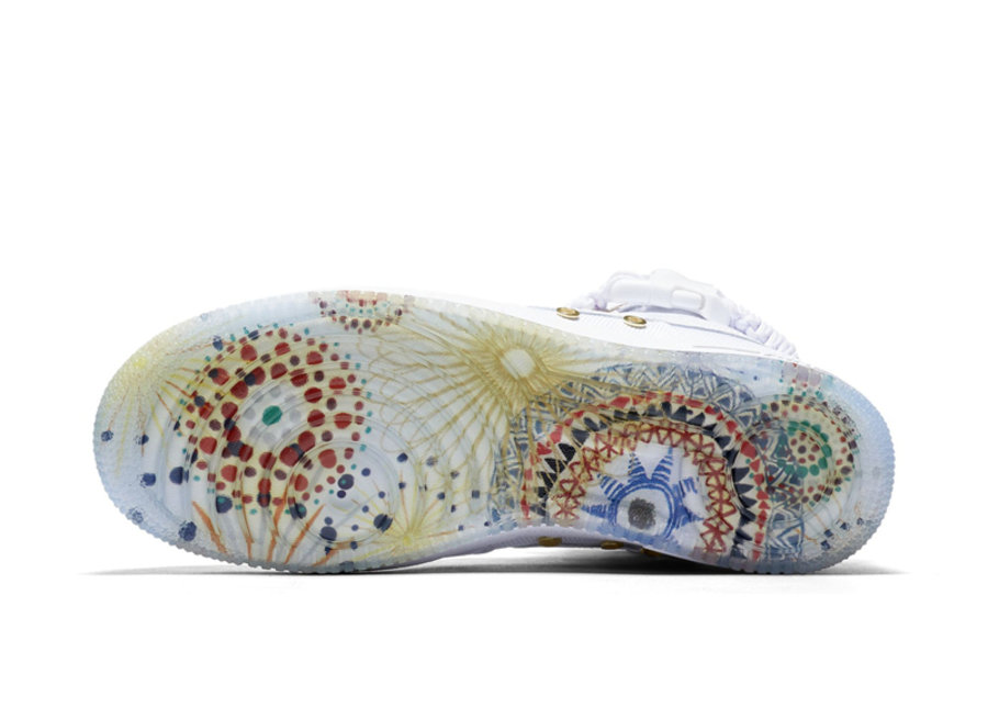 鞋款整体以白色为主调,但却在鞋带孔和鞋头扣等细节加入金色金属点缀,让整双鞋的质感瞬间升华,鞋舌处的烟花图案与鞋垫上的 “耐克” 印花都增添了中国色彩,亮点在于冰蓝色的水晶外底透出了多彩缤纷的烟花图案突出主题。