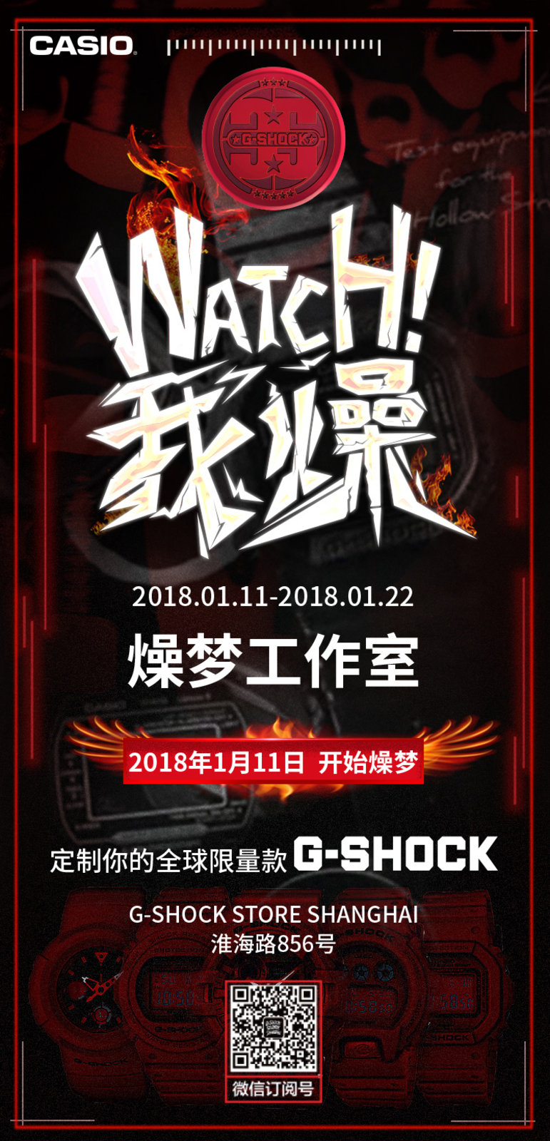 此次「Watch!我燥」的燥梦工作室将持续开放至 22 号,活动期间只要戴着 G-SHOCK 手表来到上海淮海中路的 G-SHOCK STORE,就能免费享受背刻服务以及表带印刷服务(非 G-SHOCK STORE 购买限定服务 2 块/人)。