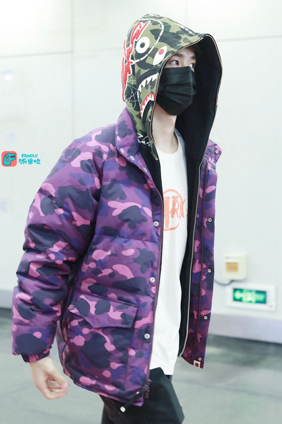 当红小生王一博选择了 FUTURA 联名鲨鱼帽衫搭配紫迷彩羽绒服,御寒又帅气!