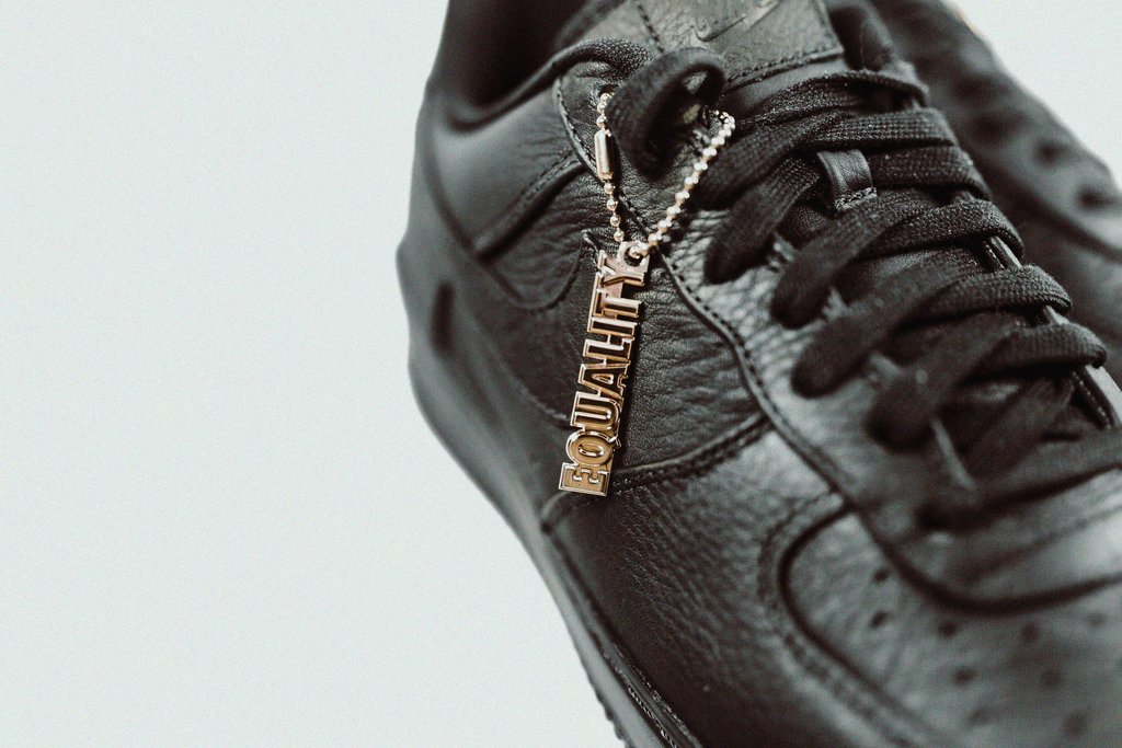 鞋款在纯黑色 Air Force 1 的基础上,后跟中底部位点缀白色 “EQUALITY” 标语,同时在鞋舌内侧有金色刺绣日期,纪念马丁·路德·金著名演讲 《I Have A Dream》,而附带的金色金属吊牌则让这双鞋的质感瞬间升华。