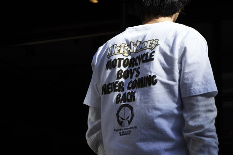 NEIGHBORHOOD 更为此次活动推出印有 “MOTORCYCLE BOYS NEVER COMING BACK” 译为 “机车男孩永不回头” 的标语周年复刻 T 恤,彰显出品牌核心文化。