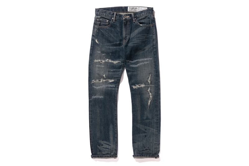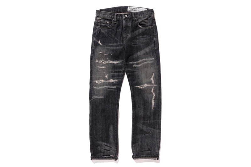 黑色与蓝色两款破坏牛仔裤,在设计中将左右裤腿特意打造成不对称的白色水洗效果,独特宽松的版型将日系风格延续。