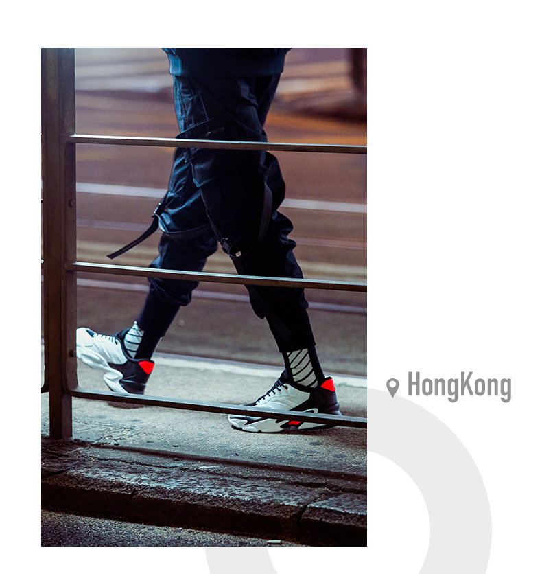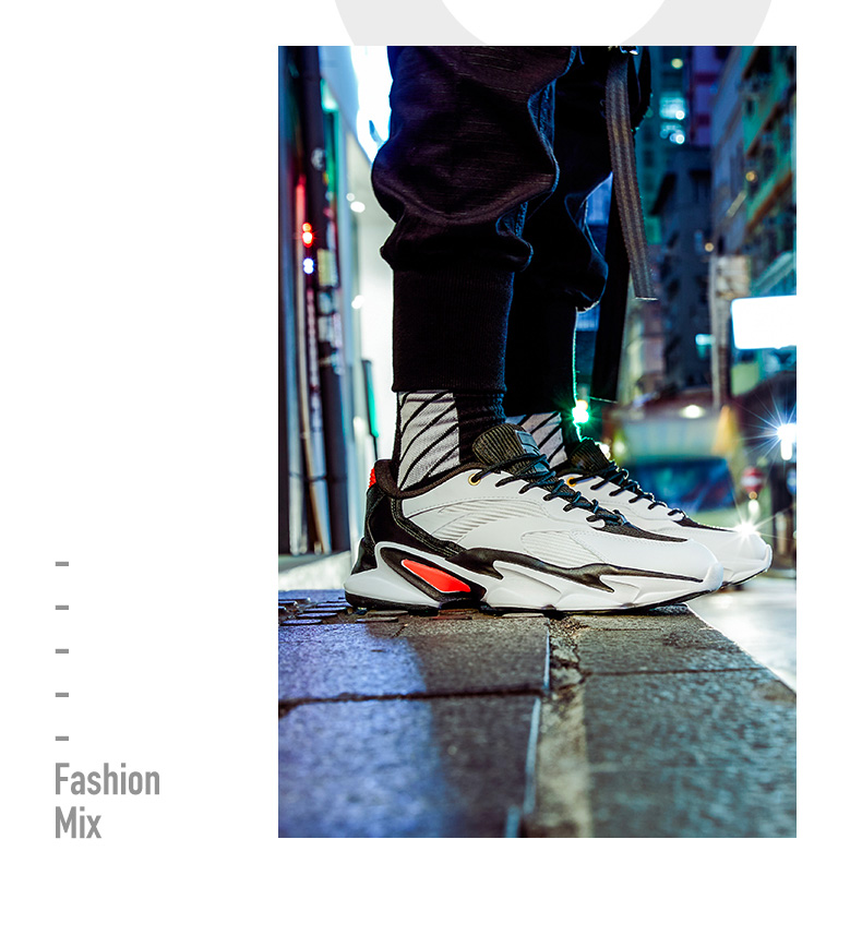 复古的老爹鞋造型,又融合了后现代科技感受的细节纹理,白黑红的色调组合也恰当好处,彰显了浓郁的 Old-School 活力气质。