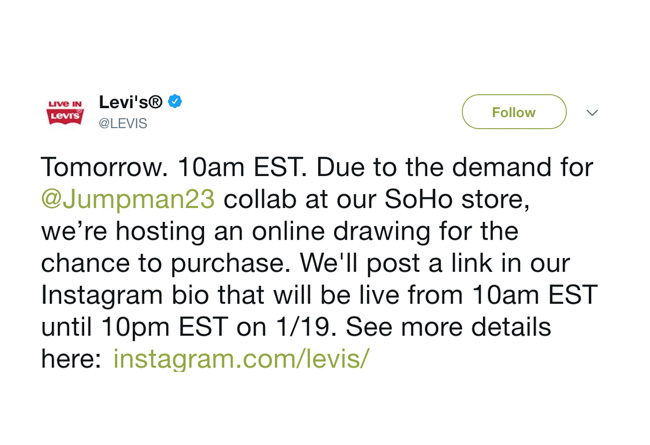 Levis 官方社交账号也在随后发布了关于这一情况的说明,并将原定的线下发售改成了线上抽签。