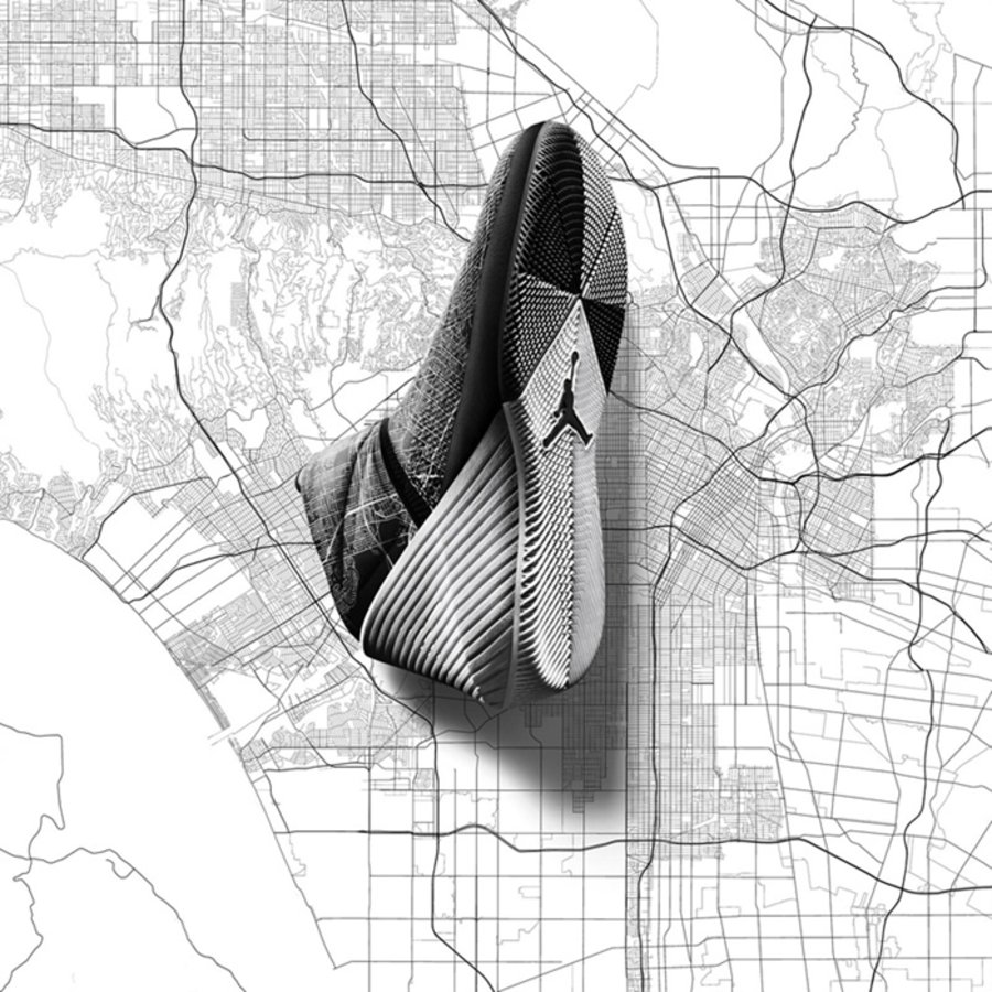 配色设计依旧此次全明星主打的黑白主题,亮点在于将洛杉矶地图印于鞋面,呈现出左右脚不同的鸳鸯效果,同时左右鞋舌分别点缀有 “LA” 和 “RW” 字样。