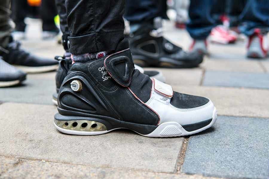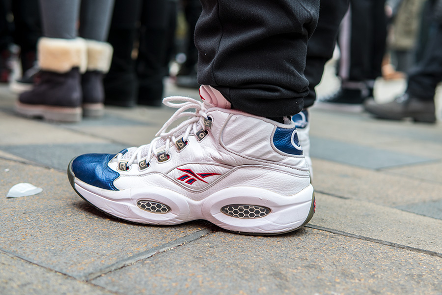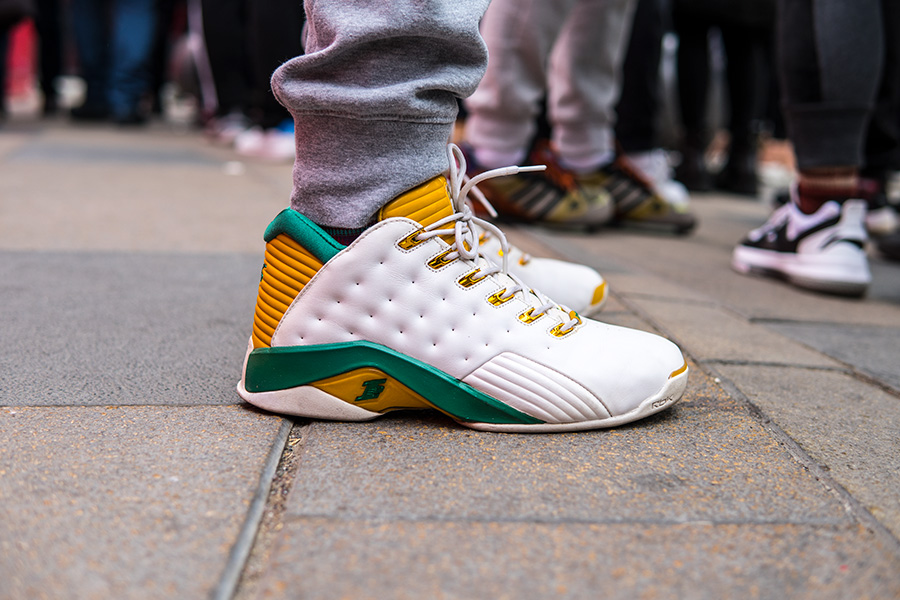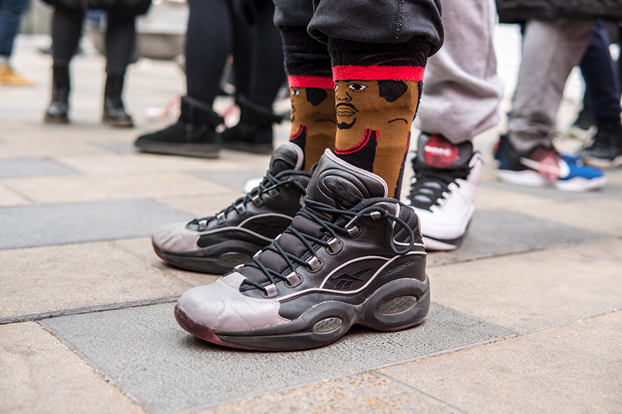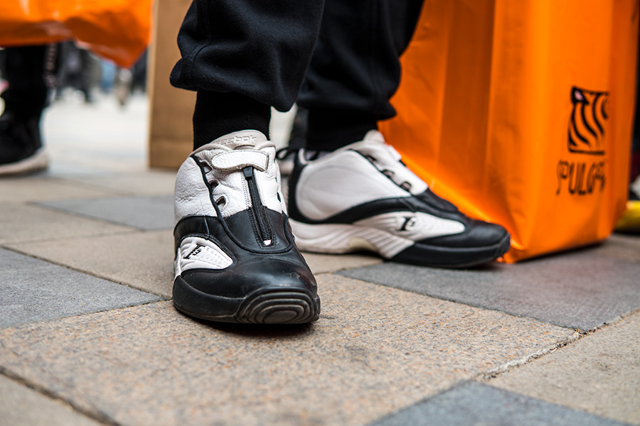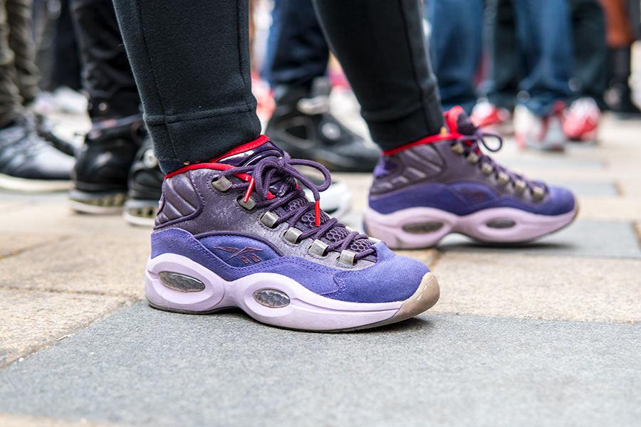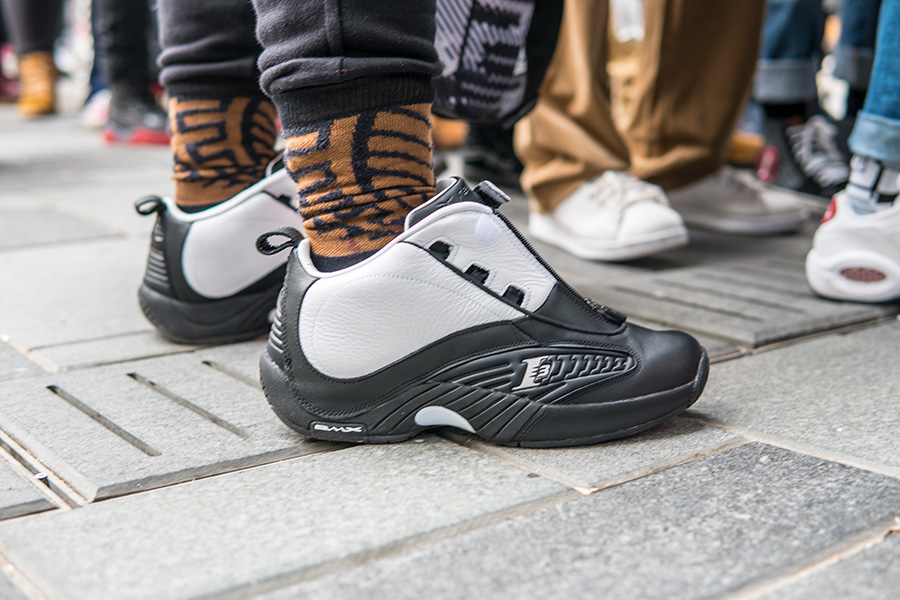 当天天气寒冷,但也抵挡不住数百位 AI 粉丝的热情,现场也聚集了大量 Reebok 球鞋,其中的艾佛森战靴则格外精彩!