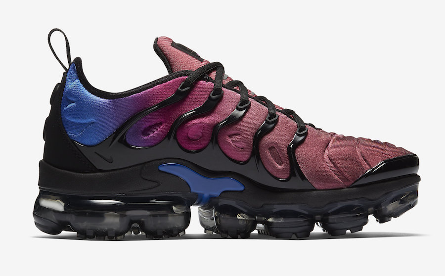 这双全新鞋型的设计竟经典鞋款 Air Max Plus 的鞋身轮廓与 VaporMax 气垫大底相结合,配色以红蓝过渡的鞋面搭配黑色细节与气垫,同时鞋面加入 3M 反光细节,兼具舒适度与时尚感。
