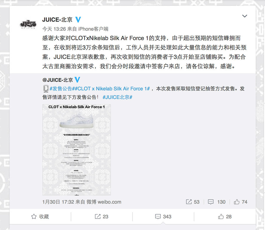 同样在 2 月 2 日,这双鞋在 JUICE 上海、JUICE 香港和深圳 POP-UP 的发售则一切正常,并无意外情况出现。