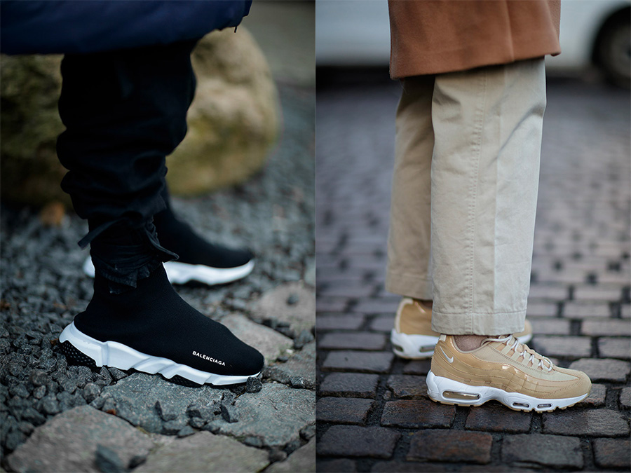 图片中的鞋款有 GOSHA x FILA T-1 Mid、CDG x Air Max 180、Air Max 98、Yeezy Boost 350 V2、Raf Simons Ozweego、Vans Old Skool、Virgil Abloh x Nike 和 Balenciaga Speed Trainer。