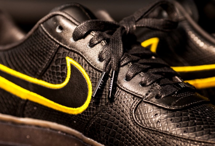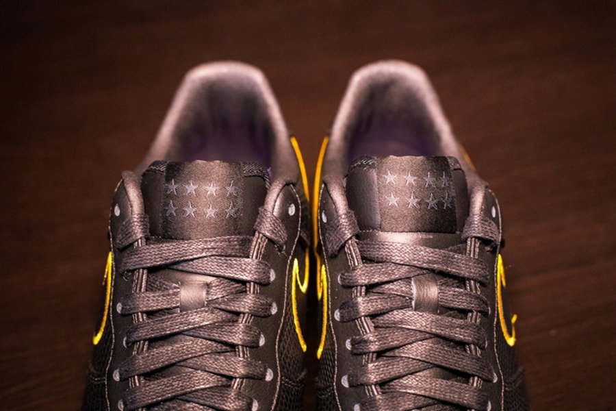 本次选用经典鞋型 Air Force 1 Low 为设计蓝本,整体配色方案以一袭纯黑装扮贯穿,搭配象征着湖人队的金色元素点缀细节。