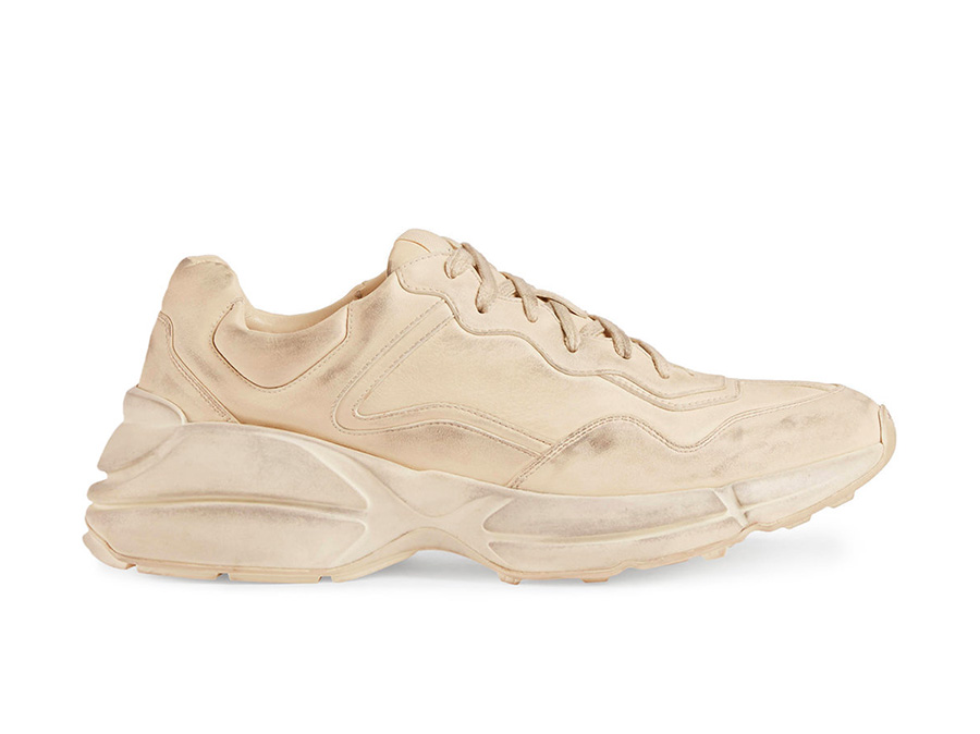 象牙色皮革打造的 Gucci Rhyton 运动鞋,既有大 LOGO 夸张呈现的配色,也有简约的做旧配色。是要低调的奢侈,还是高调的华丽,可以自行选择,其中带有 LOGO 的款式更为抢手。